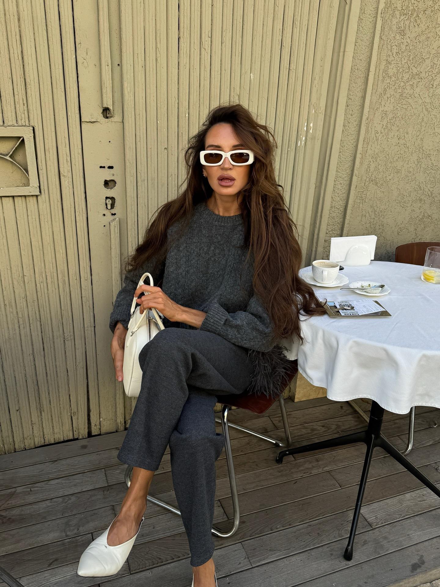 Elegant Grey Feather Hem Knitted Sweater Women Loose Round Neck Long Sleeve Pullover Top Autumn Winter Soft Cotton Blend Jumper Commuter Style