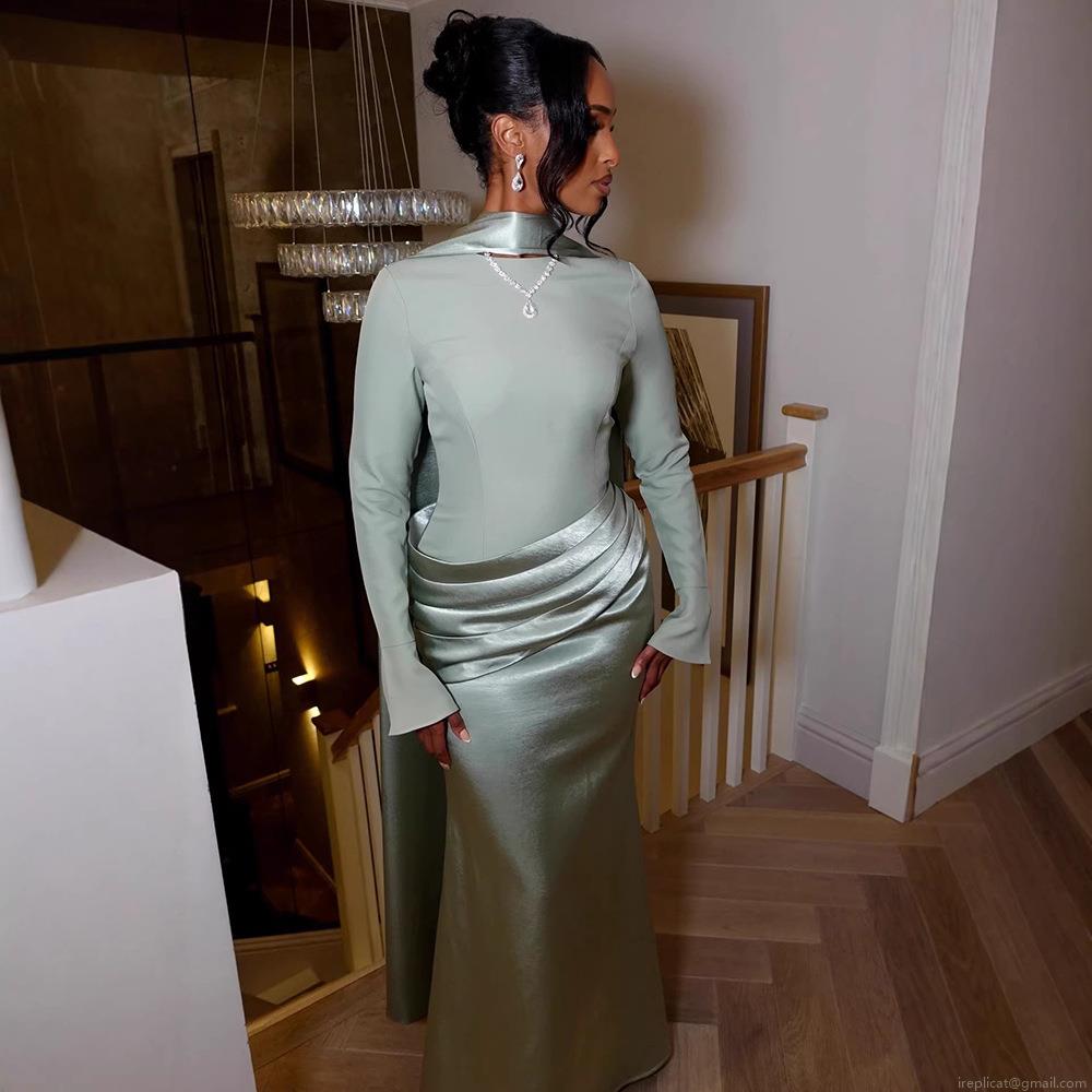 Elegant Muslim Maxi Dress For Women Satin Patchwork Ruched Long Sleeve Evening Gown Party Mermaid Long Gown With Scarf Modest Formal Dress