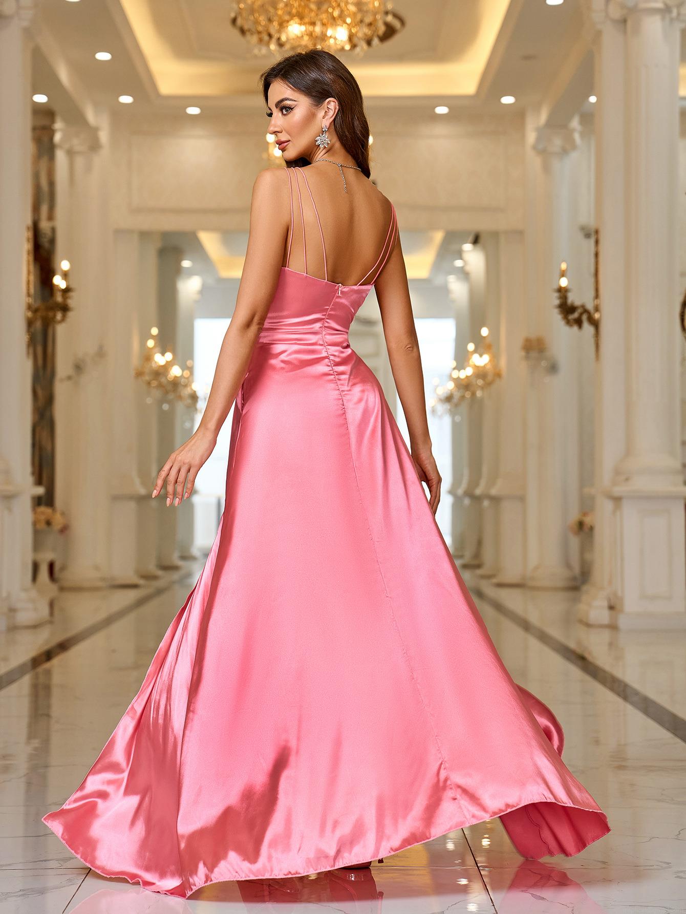 Elegant Pink Polyester Satin Spaghetti Strap Evening Dress High Slit Square Neck Pockets Floor Length Maxi Prom Gown For Women Wedding Party Bridesmaid