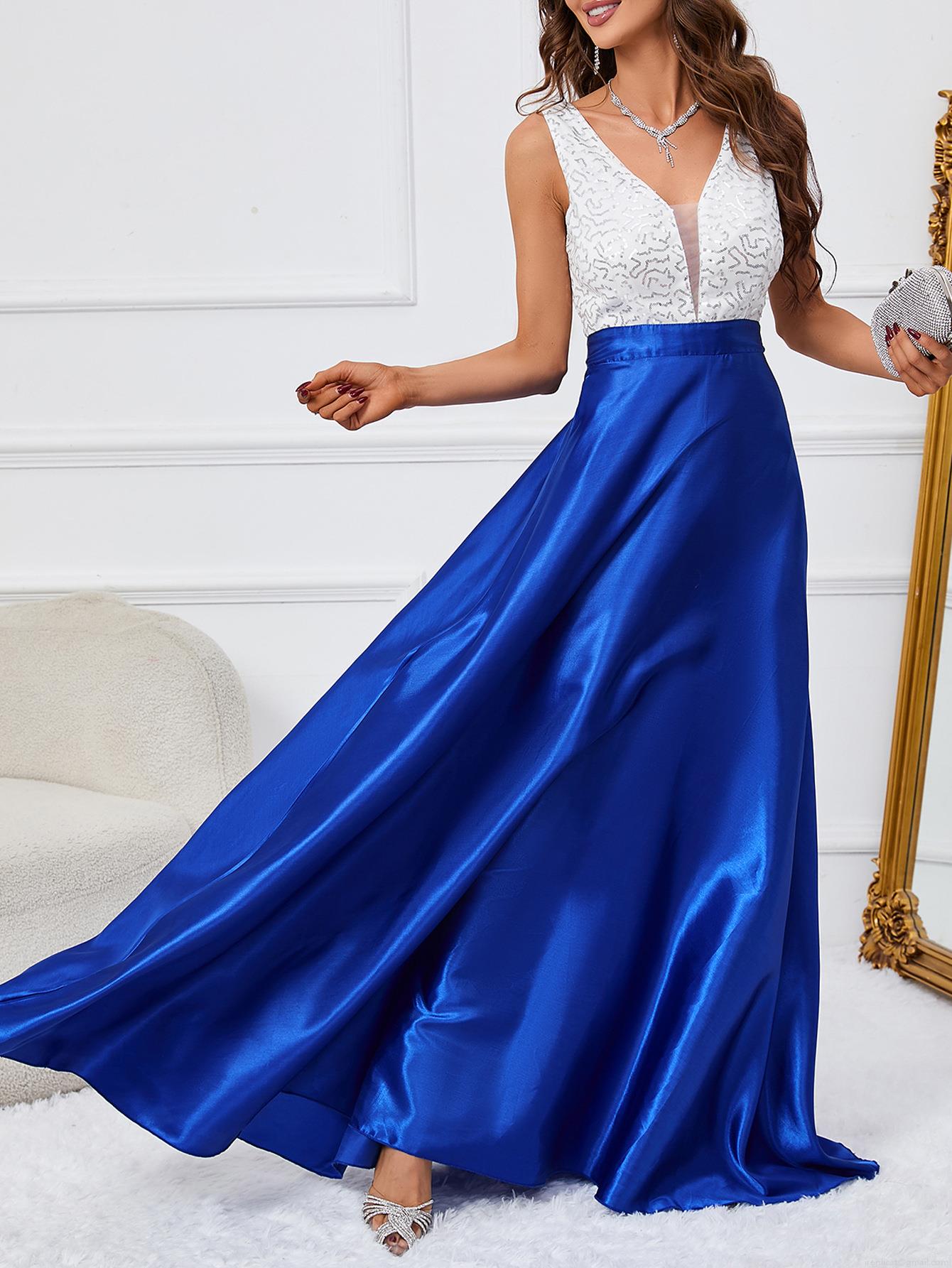 Splice, Sequin, Color Blocking, V-neck, Backless, Cake Skirt