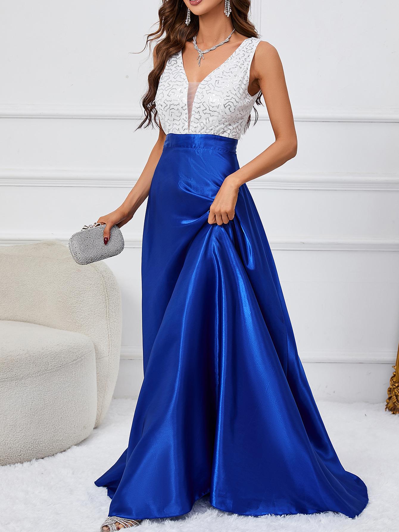 Elegant V-Neck Sleeveless Sequin Patchwork Maxi Dress Sexy Backless Satin A-Line Evening Party Gown For Women