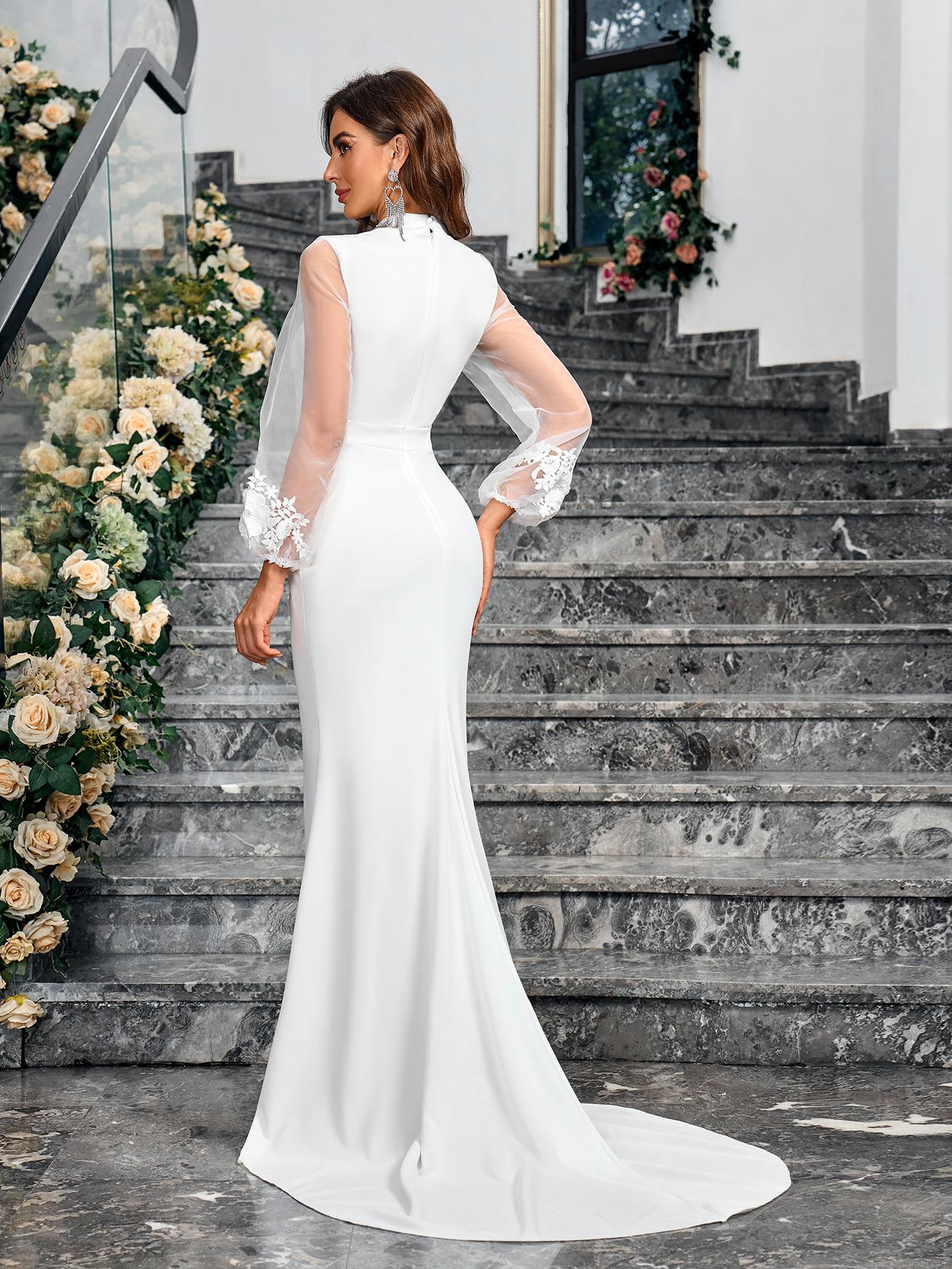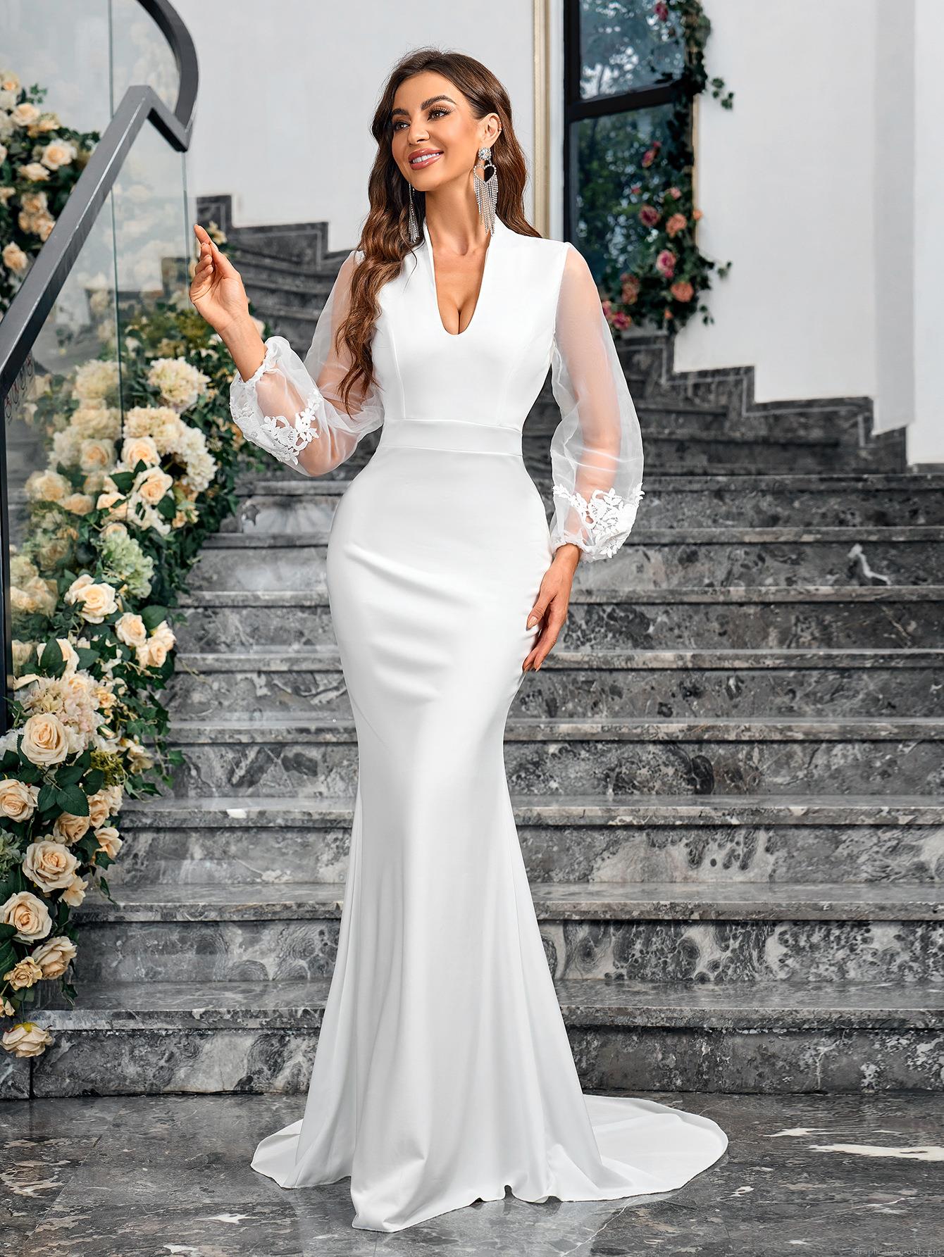 Elegant White Evening Dress For Women V-Neck Transparent Lace Puff Sleeves Fishtail Mermaid Wedding Gown Formal Party Banquet Slim Fit Maxi Dress