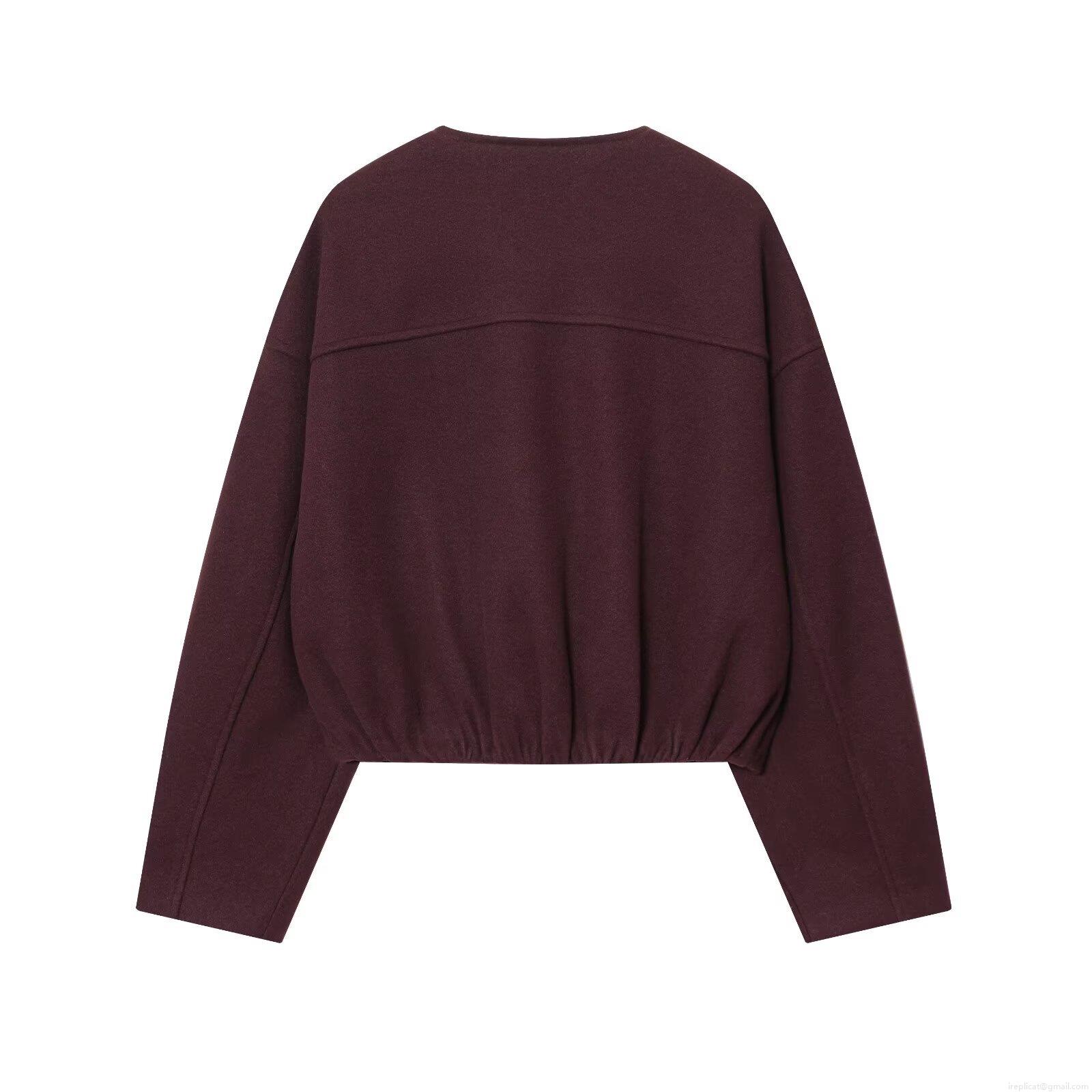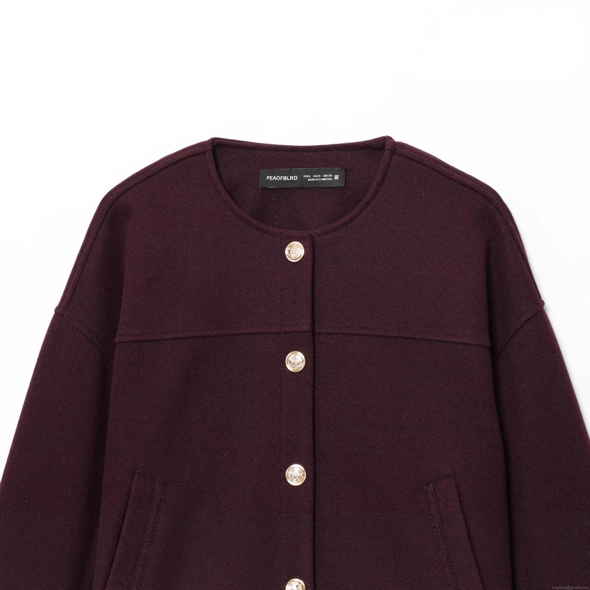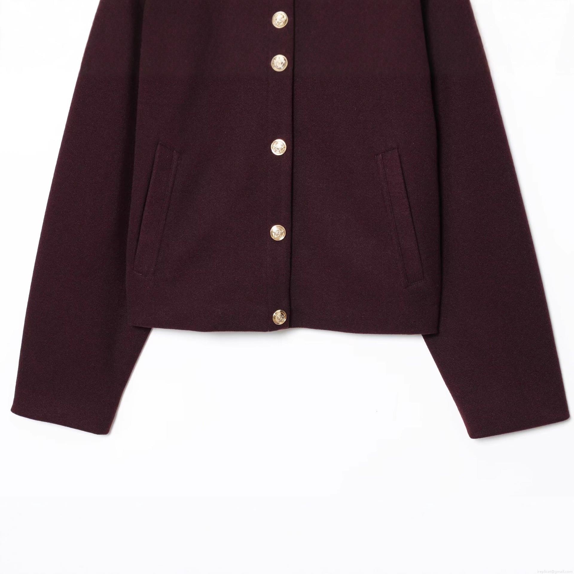 Elegant Women Burgundy Red Short Jacket Coat With Embossed Gold Buttons Crew Neck Long Sleeve Woolen Style Polyester Outerwear For Lady Casual Fashion