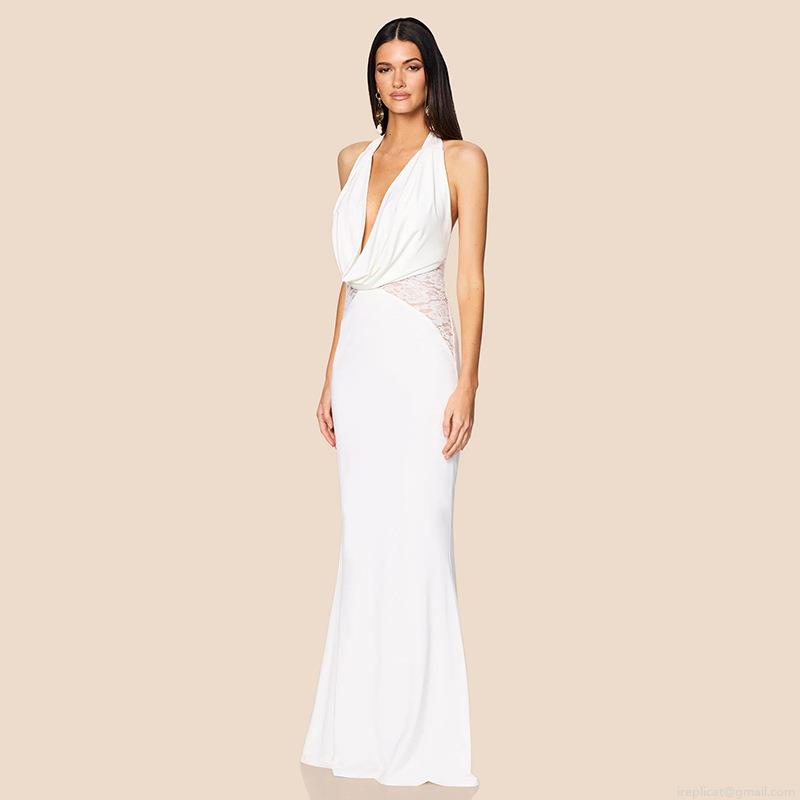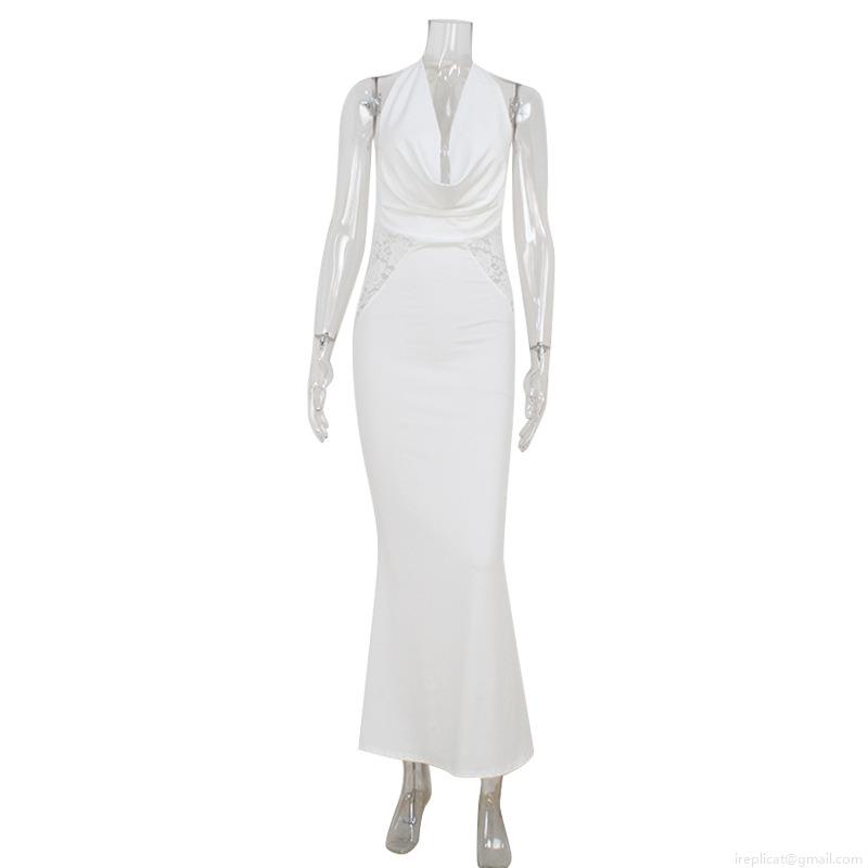 Elegant Women Halter V-Neck Backless Evening Gown Sexy Lace Splicing Bodycon Maxi Dress For Wedding Party Formal Event Slim Fit Floor Length Dress