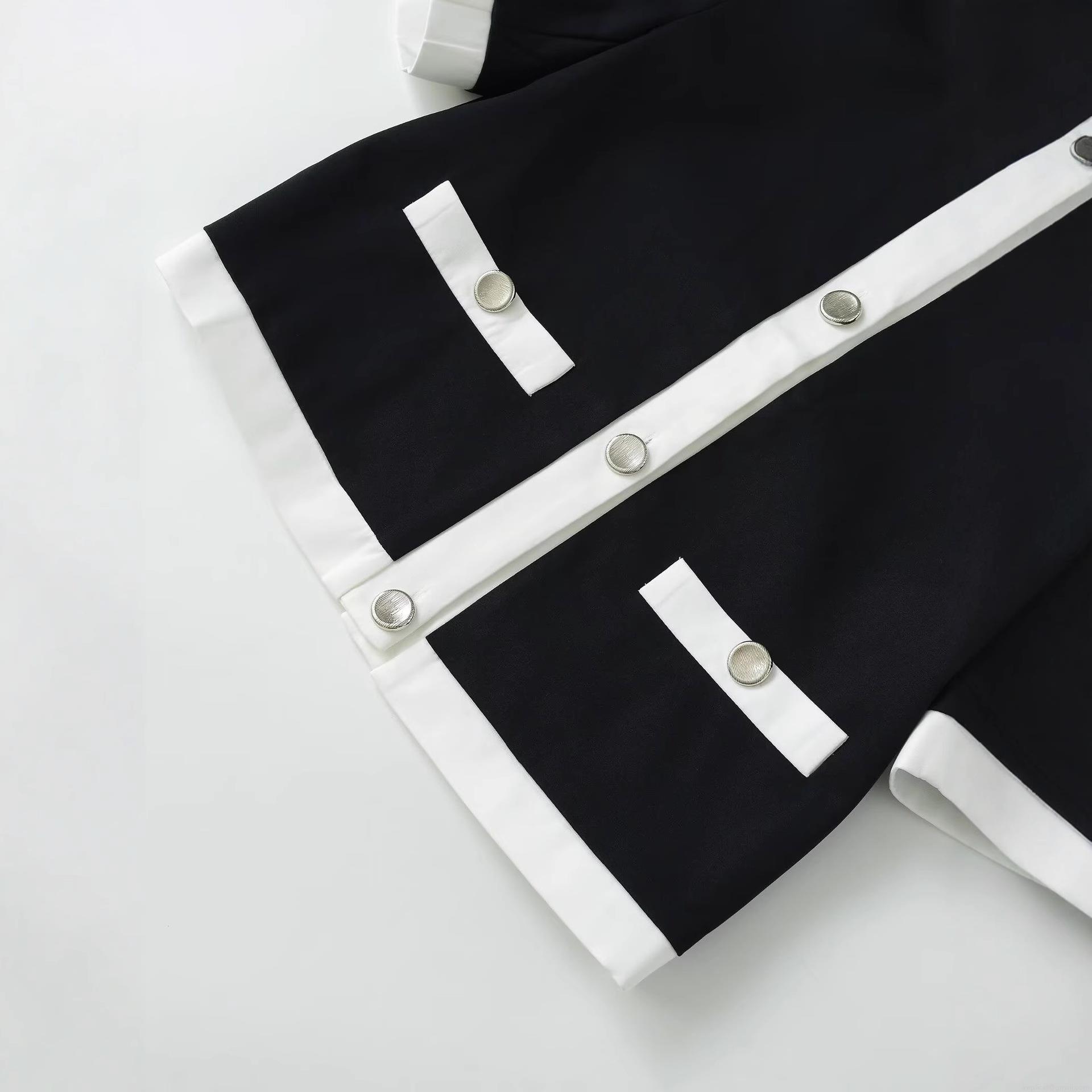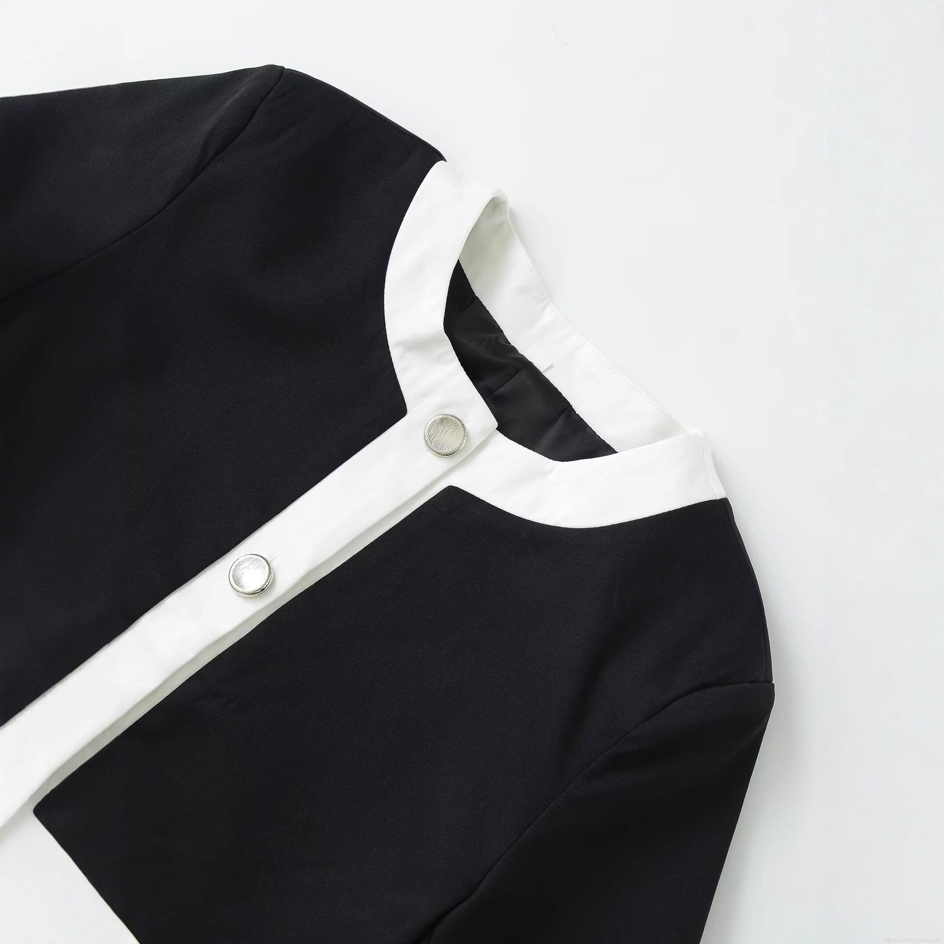 Elegant Women Short Sleeve Contrast Trim Jacket 100% Polyester Cropped Outerwear With Silver Metal Buttons Lady Style Commuting Round Neck Coat