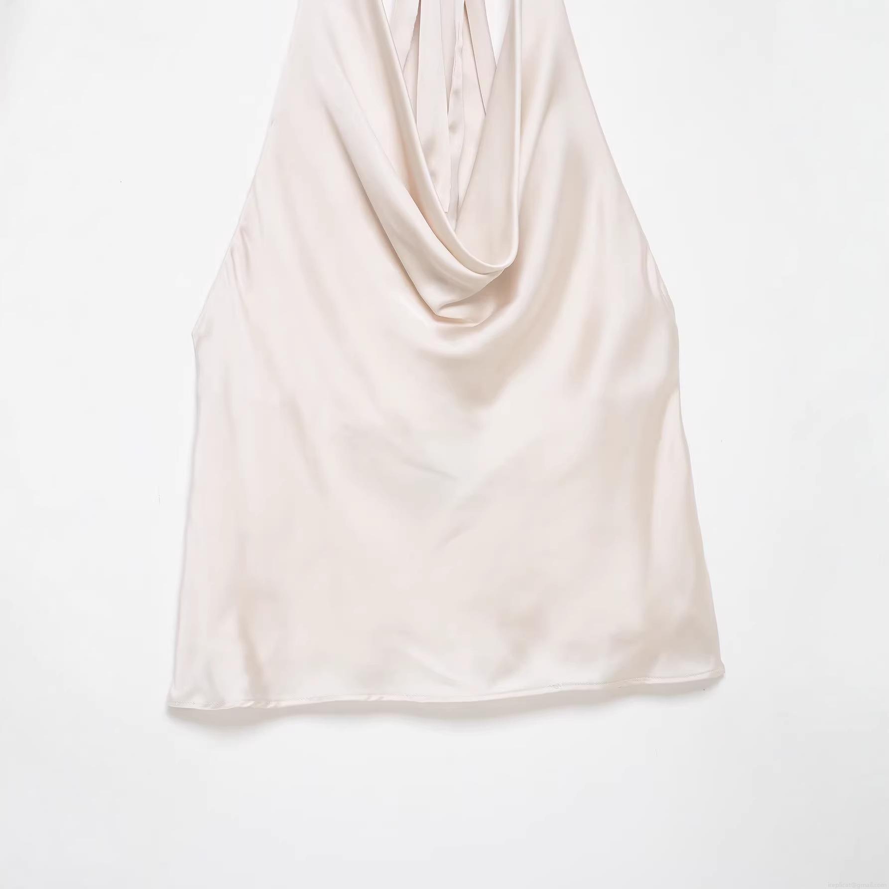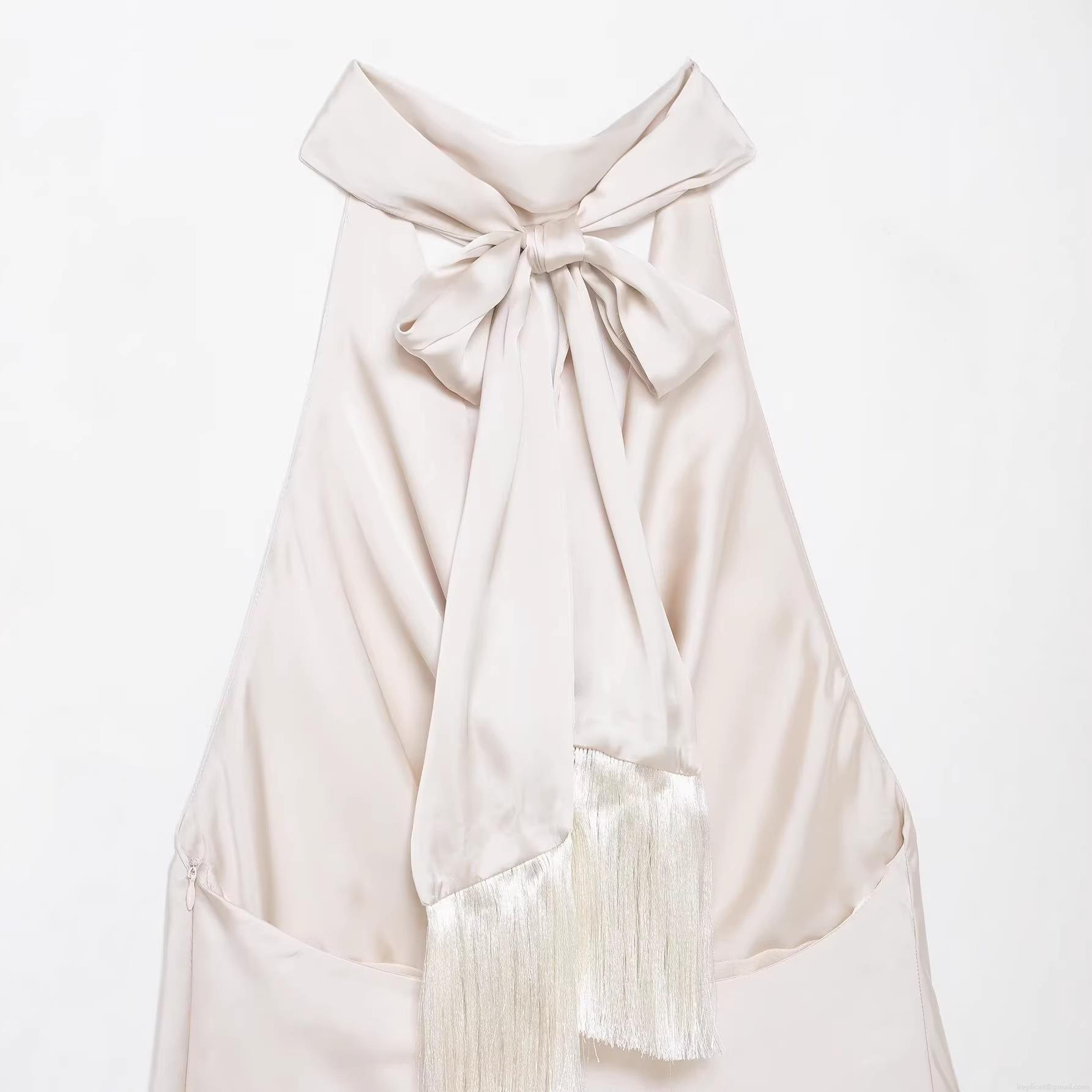 Elegant Women Silky Satin Cowl Neck Halter Top Sleeveless Backless With Bow Tie Tassel For Party Club Streetwear Solid Color Sexy Style