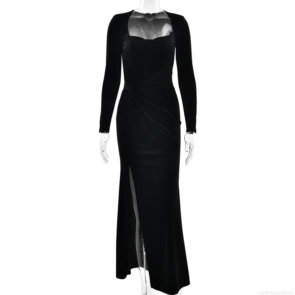 Elegant Women Velvet Square Neck Ruched Split Maxi Dress Sexy Long Sleeve Slim Fit Evening Party Formal Gown With Hidden Zipper