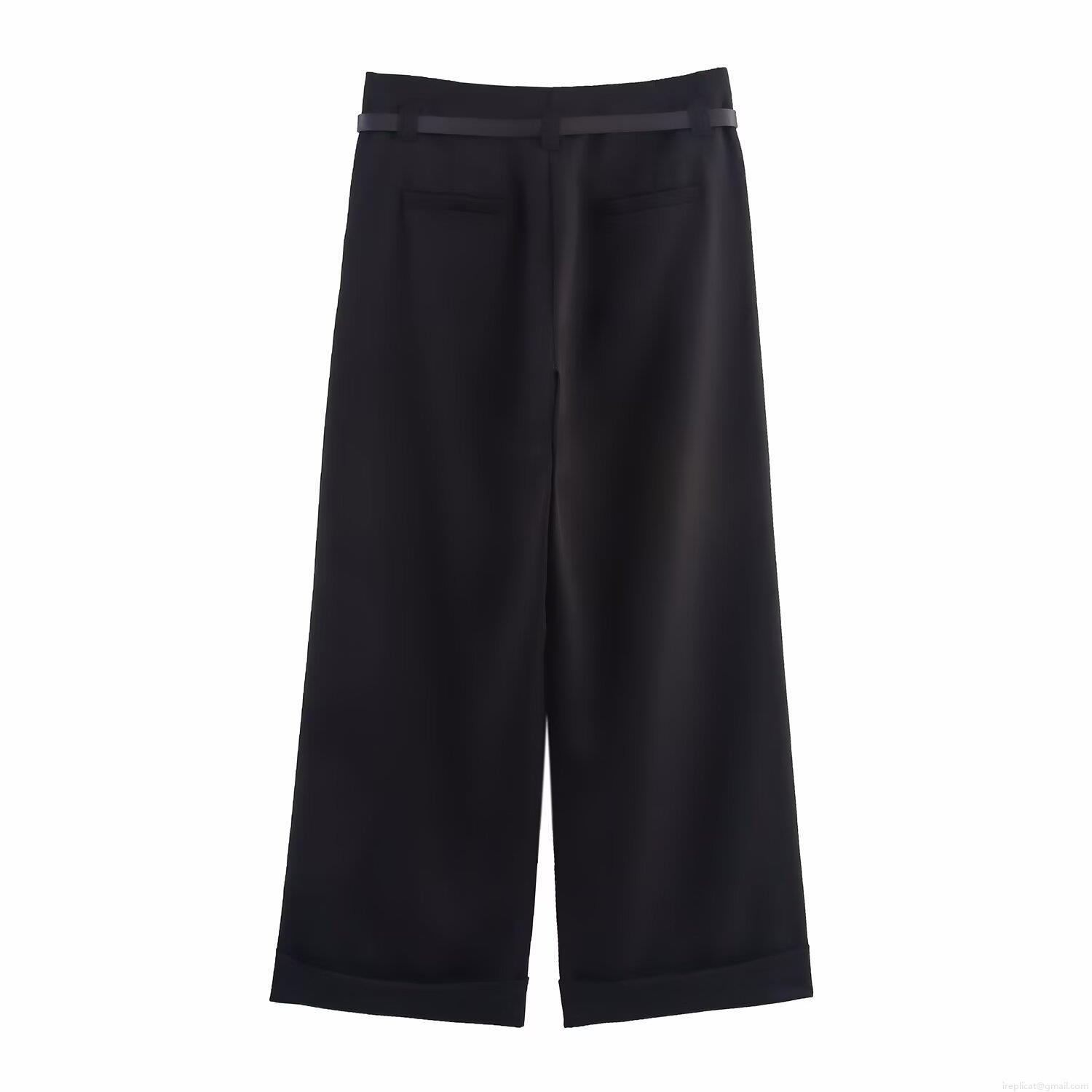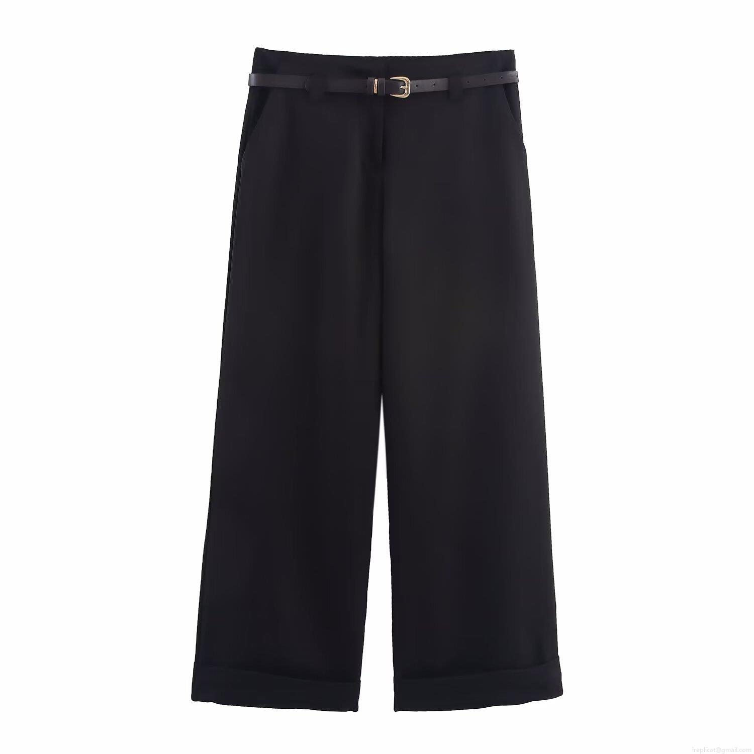 Elegant Women's High Waist Wide Leg Pants With Black Leather Belt Cuffed Hem Office Work Polyester Trousers Casual Straight Leg Bottoms