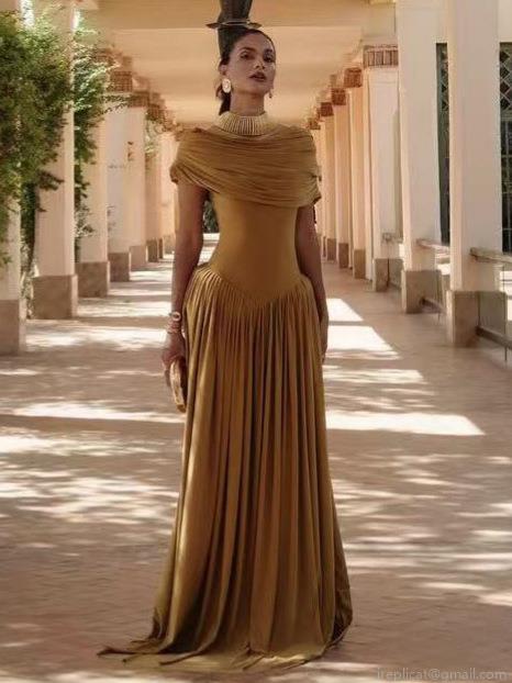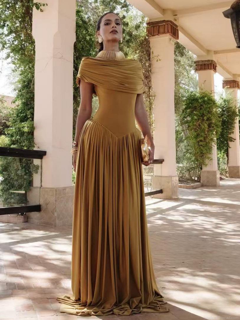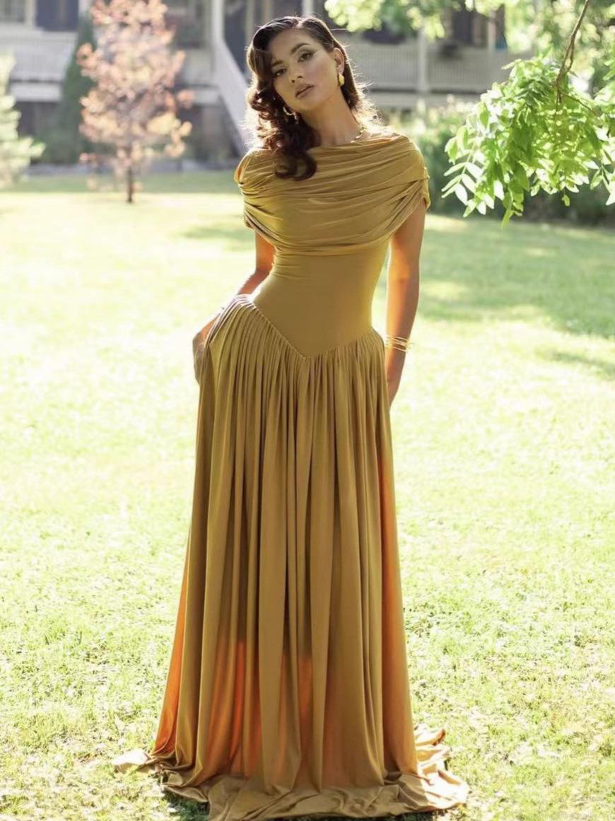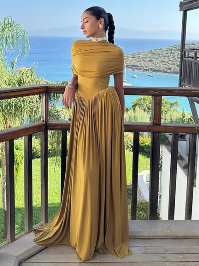 Elegant Women's Off-Shoulder Pleated Maxi Dress Mustard Yellow Polyester Slim Fit Evening Gown For Party Banquet Wedding Guest Long Dress