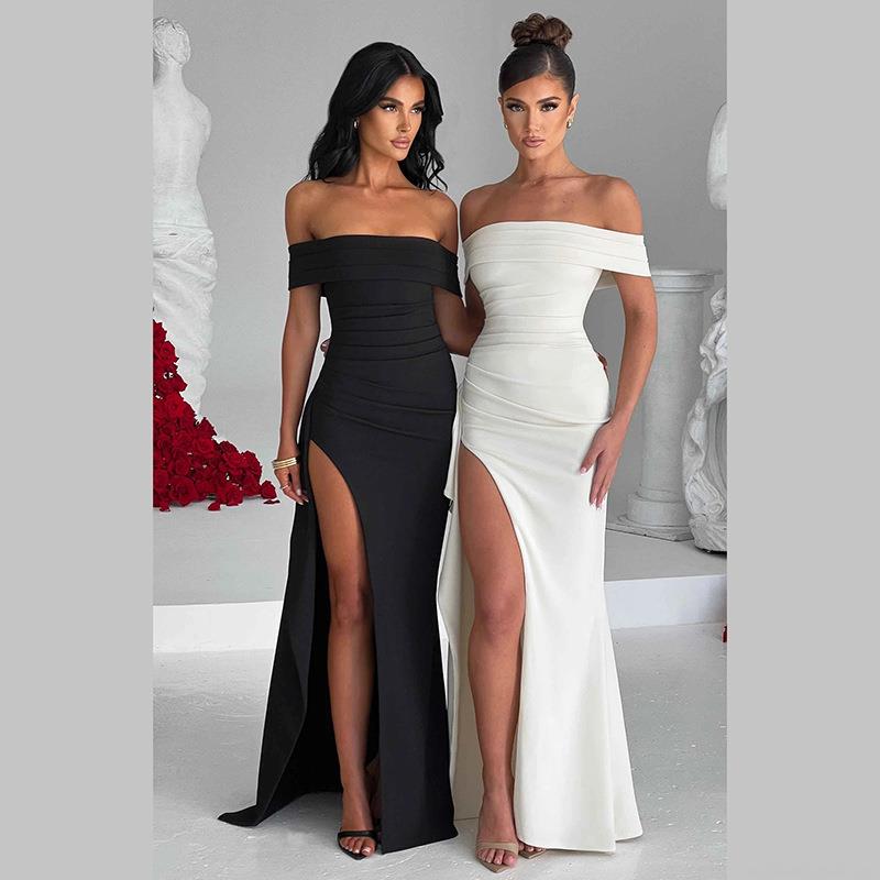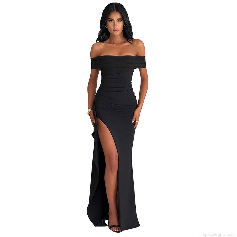Elegant Women's Off-The-Shoulder High Slit Evening Gown Slim Fit Ruched Bodycon Maxi Dress For Party Wedding Banquet Formal Occasion Sexy Clubwear