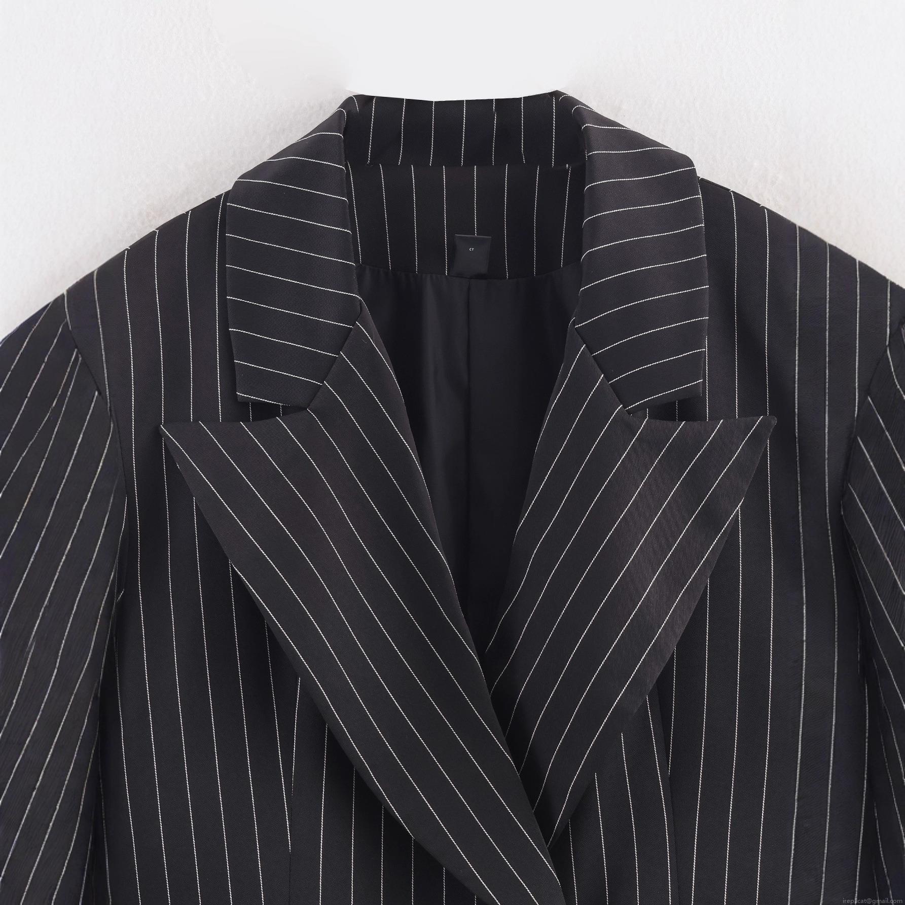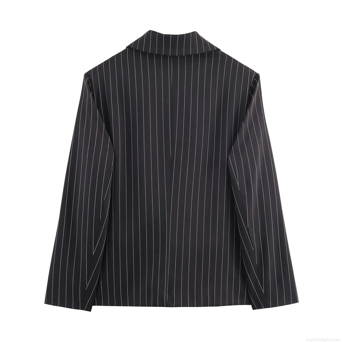 French Chic Women's Pinstripe Polyester Blazer Notched Lapel Single Button Long Sleeve Office Commuter Suit Jacket Outwear With Pockets