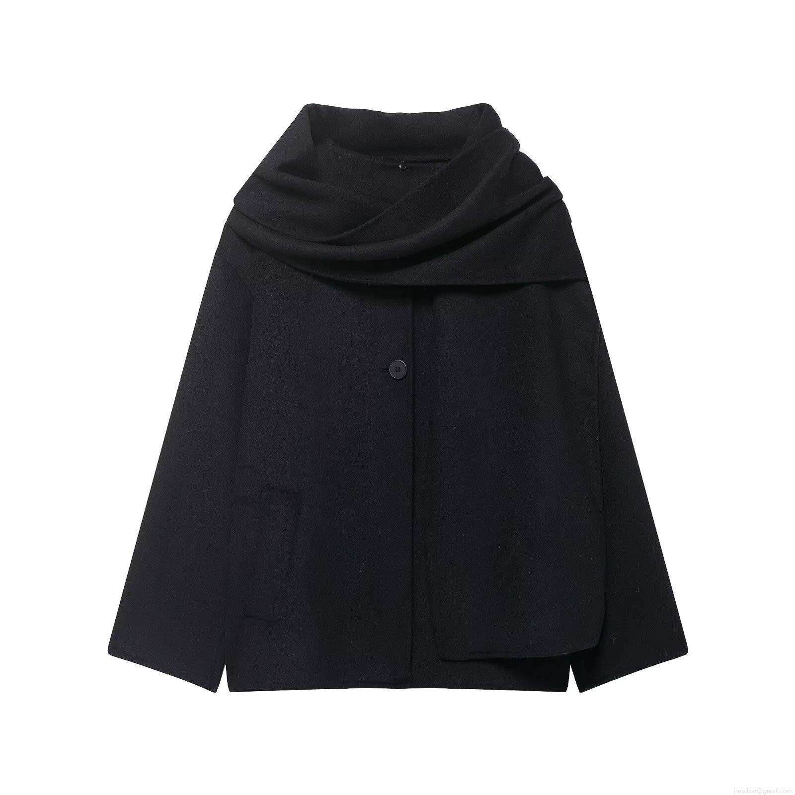 French Fashion Women's Short Wool Blend Outerwear With Integrated Scarf Collar Single Breasted Solid Color Warm Jacket For Autumn Winter Elegant Casual Wear