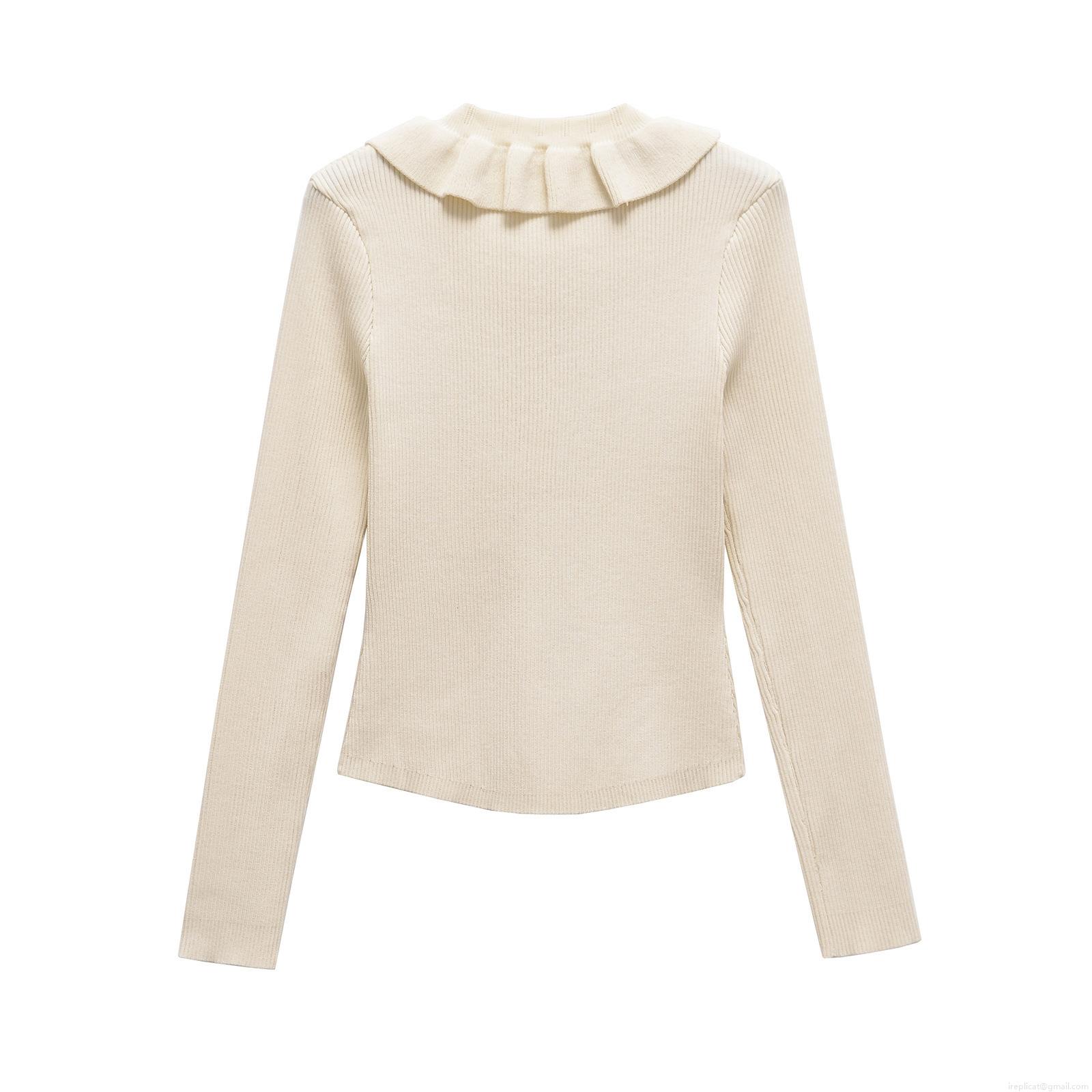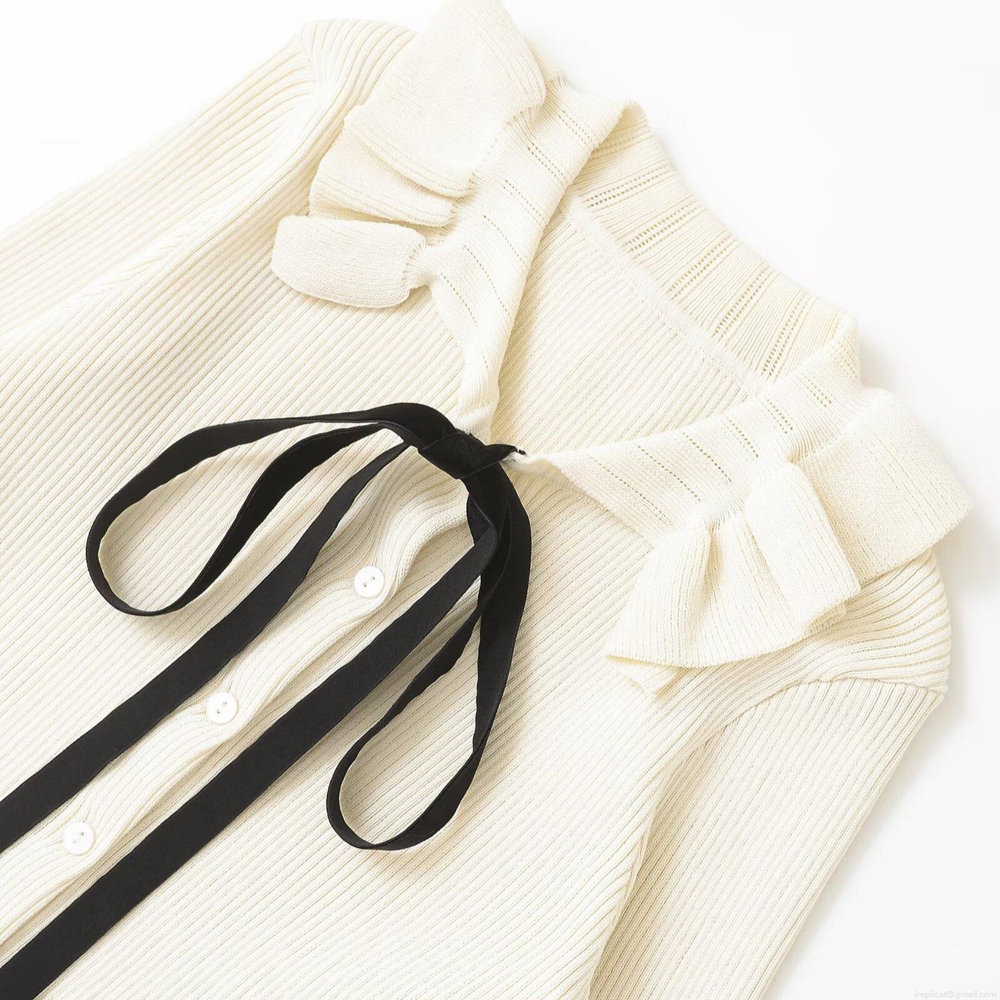 French Style Ruffle Collar Bow Decoration Knit Cardigan Long Sleeve Ribbed Button Front Sweater Top For Women Casual Chic Streetwear