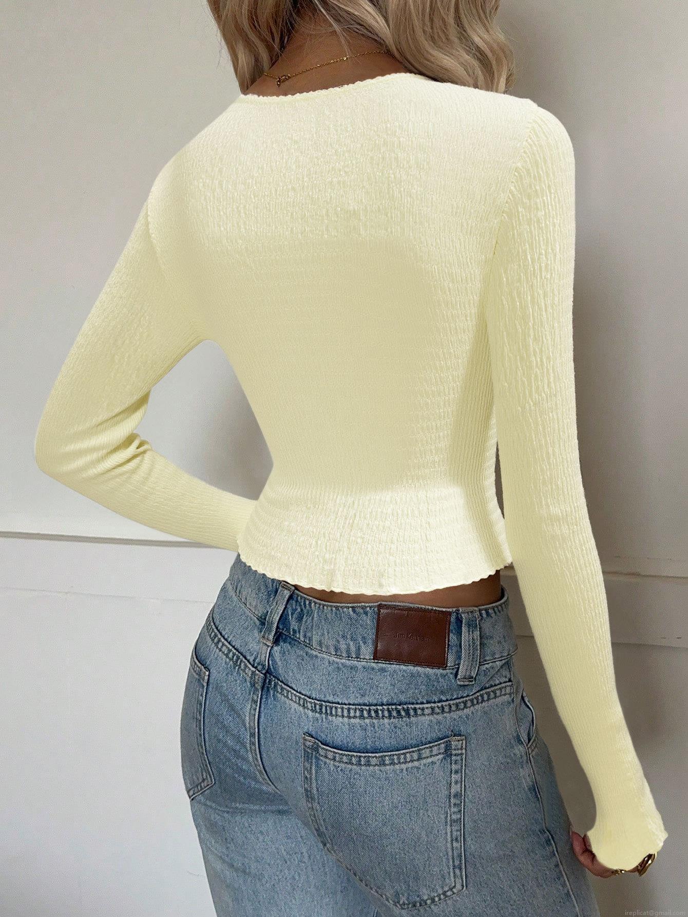 French Style Square Neck Long Sleeve Top Elegant Ruffle Hem Slim Fit Cream Apricot Crinkle Texture Blouse For Women Casual Party Autumn Winter