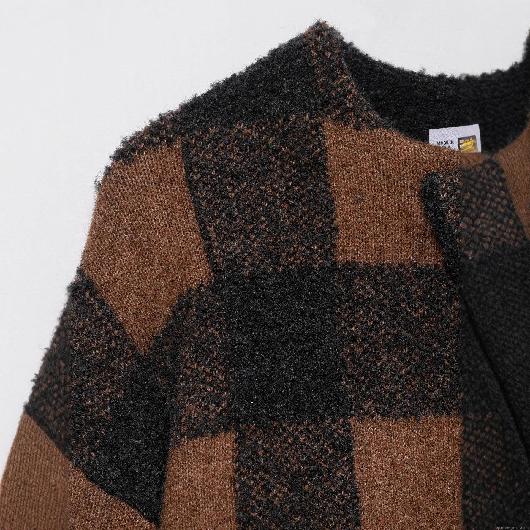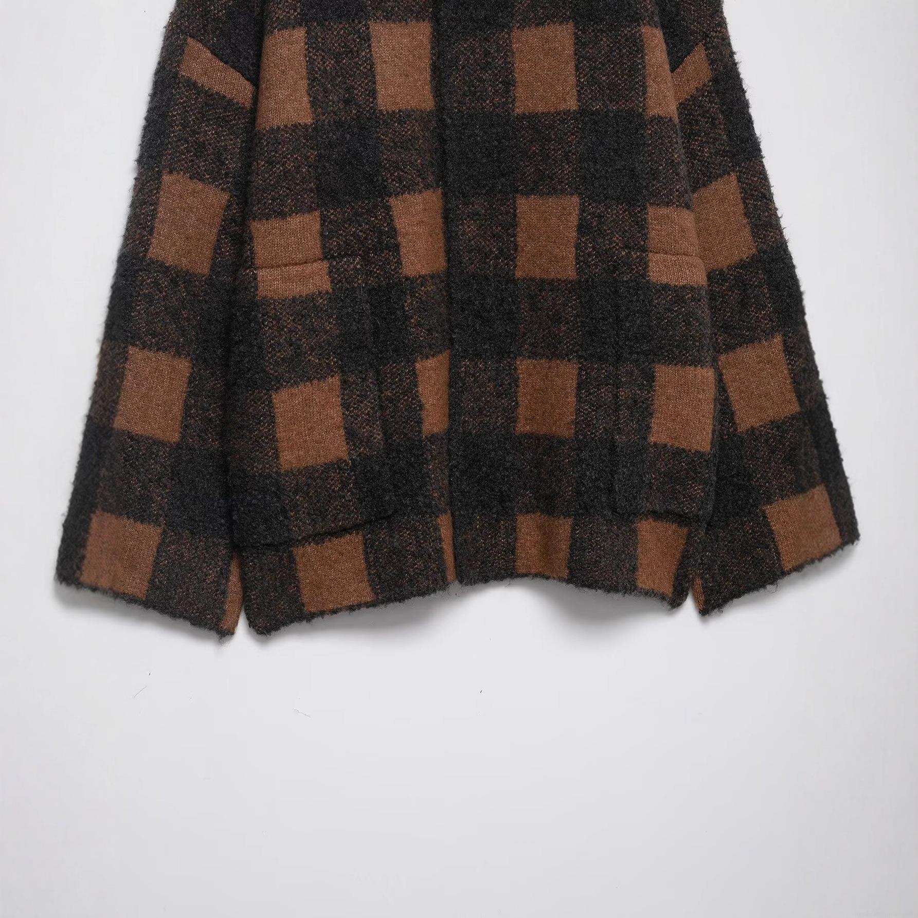 French Style Women's Plaid Knit Outerwear Round Neck Long Sleeve Button Up Fuzzy Checkerboard Cardigan Casual Warm Winter Coat