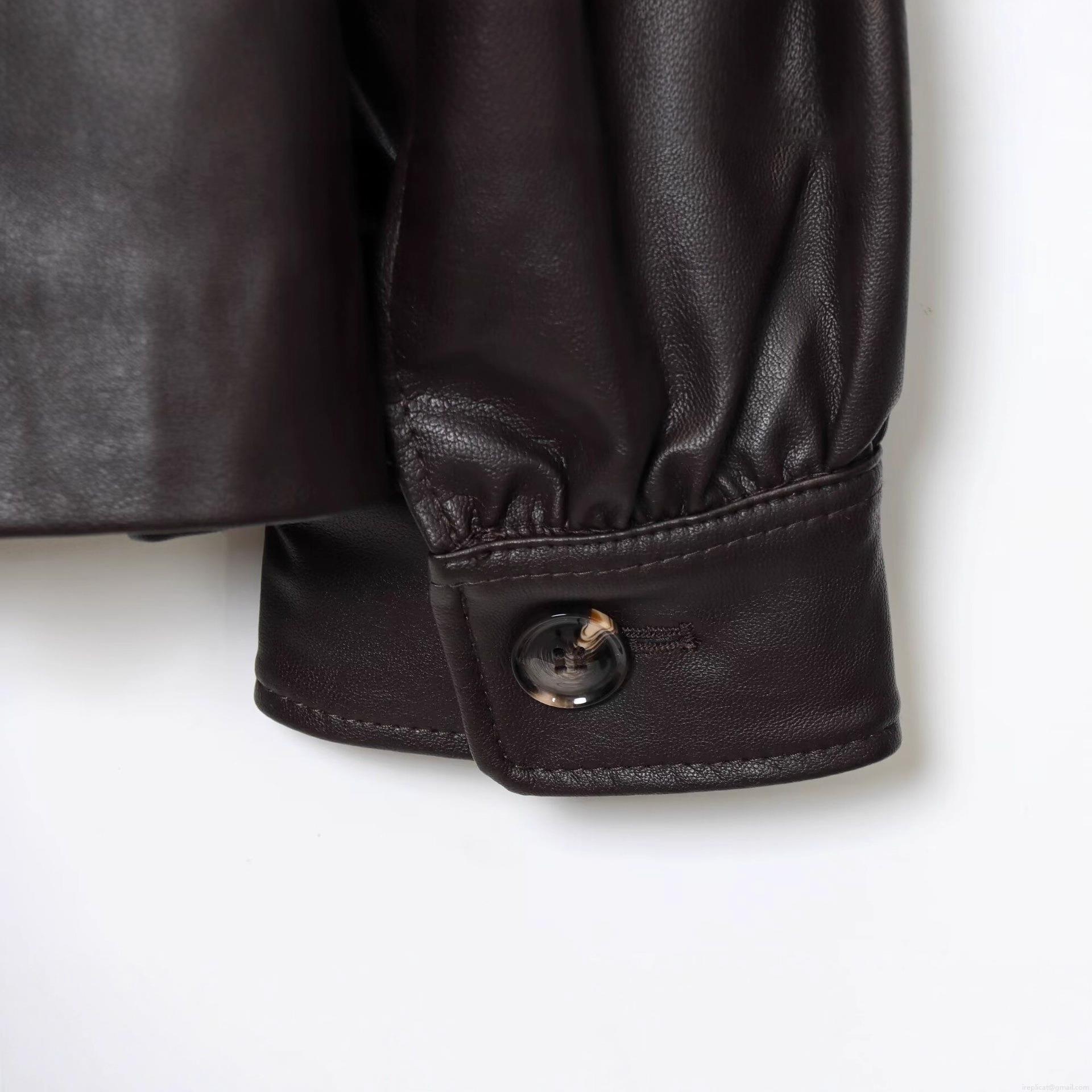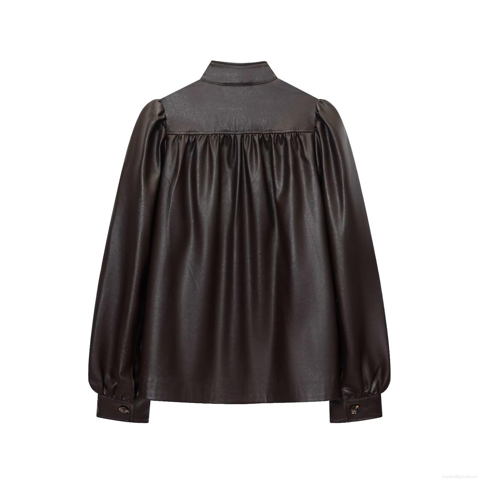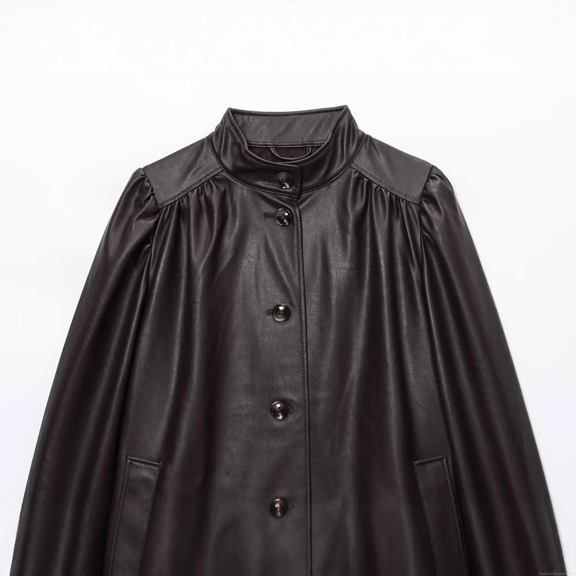 French Vintage Women PU Leather Jacket Lantern Sleeve Stand Collar Single Breasted Solid Dark Coffee Pleated Short Coat Autumn Spring Fashion Elegant Outerwear