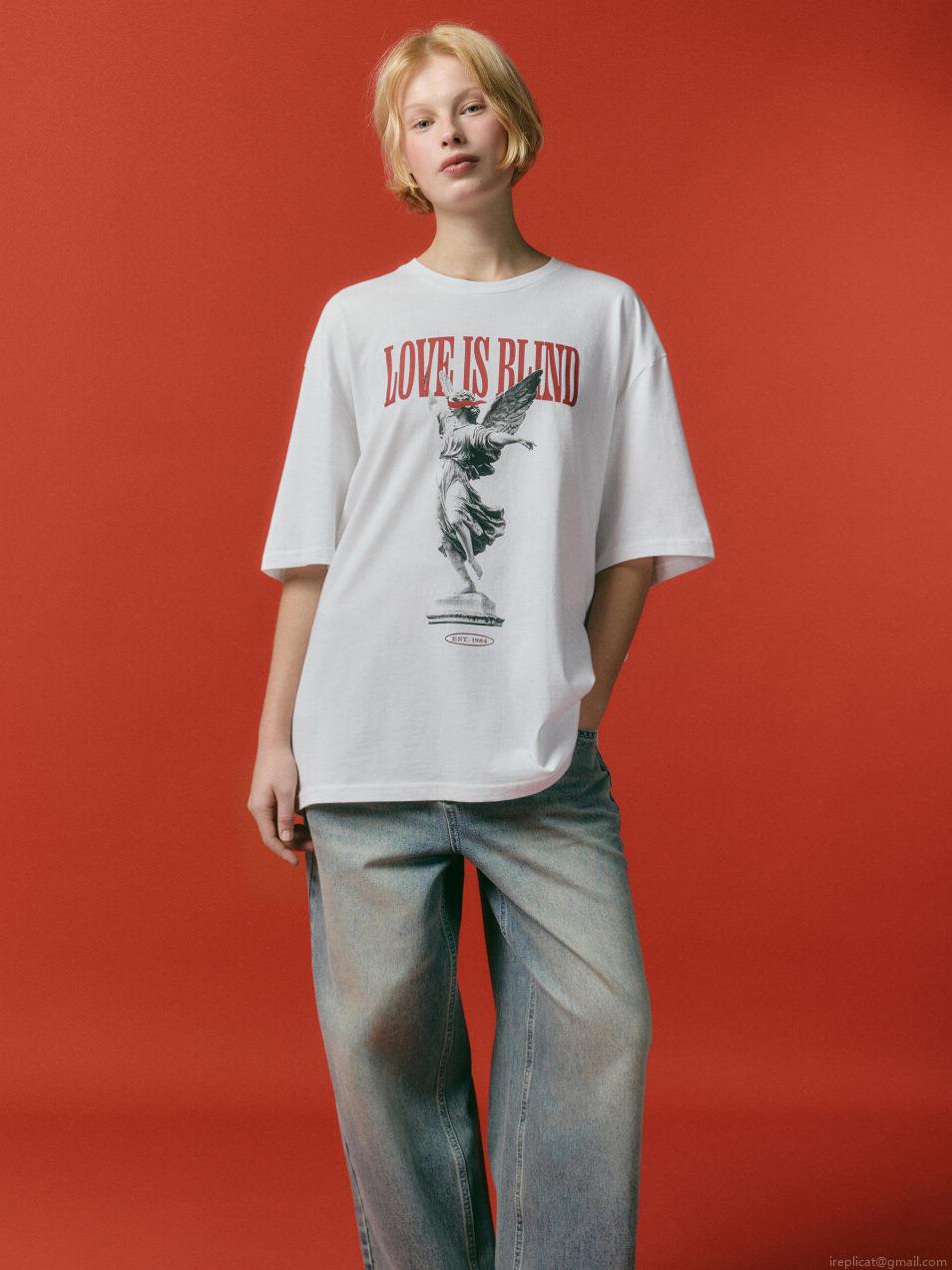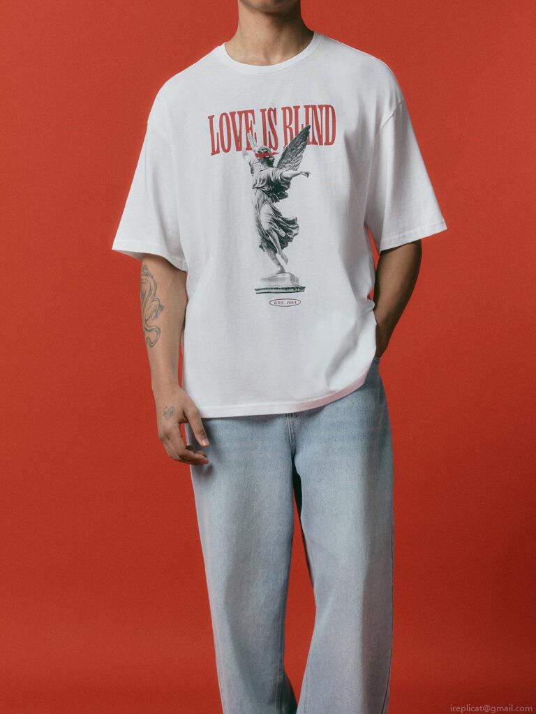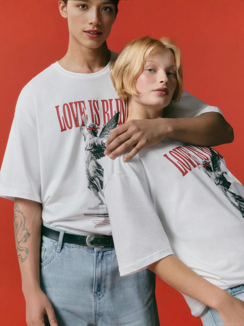 Graphic T-Shirt Women Men Cotton Blend Streetwear Love Is Blind Print Loose Casual Short Sleeve Retro Angel Tee Couple Tops Unisex Fashion Clothing