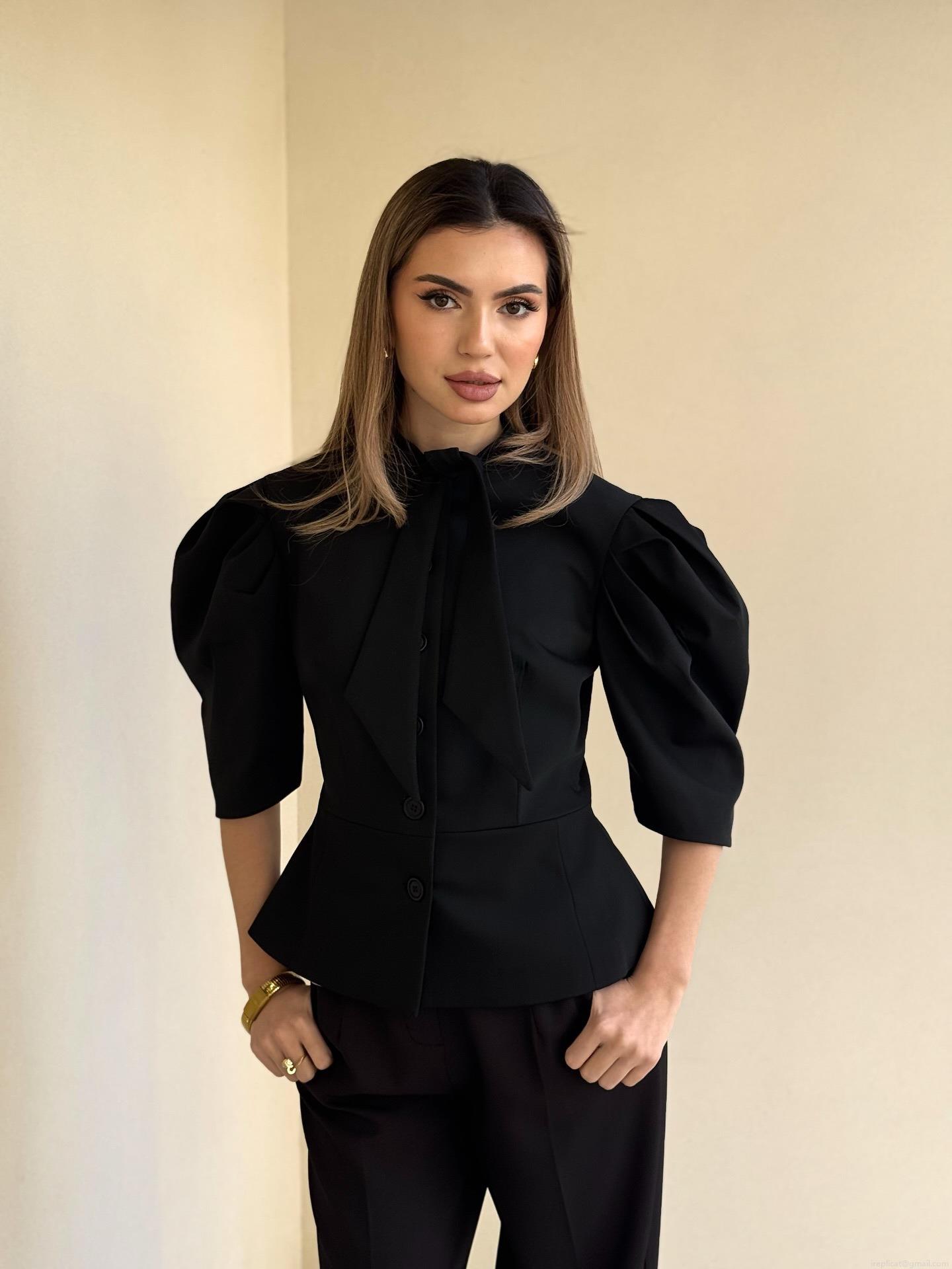 Hepburn Style Women Puff Sleeve Top Cotton Blend Woven Slim Fit Single Breasted Blouse With Bow Tie Collar Casual Solid Color Semi Sleeve T-Shirt