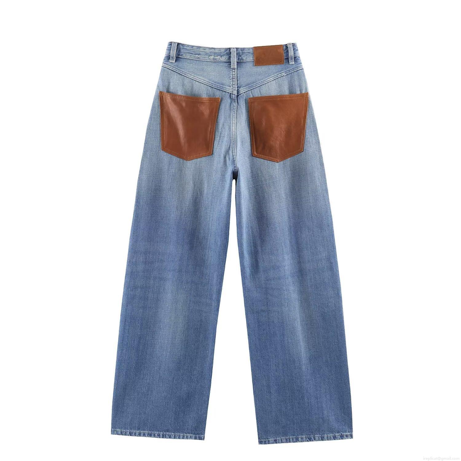 High Waisted Wide Leg Jeans With Brown Leather Pockets Washed Blue Denim Pants Retro Casual Straight Leg Trousers For Women Streetwear Fashion Loose Denim Bottoms