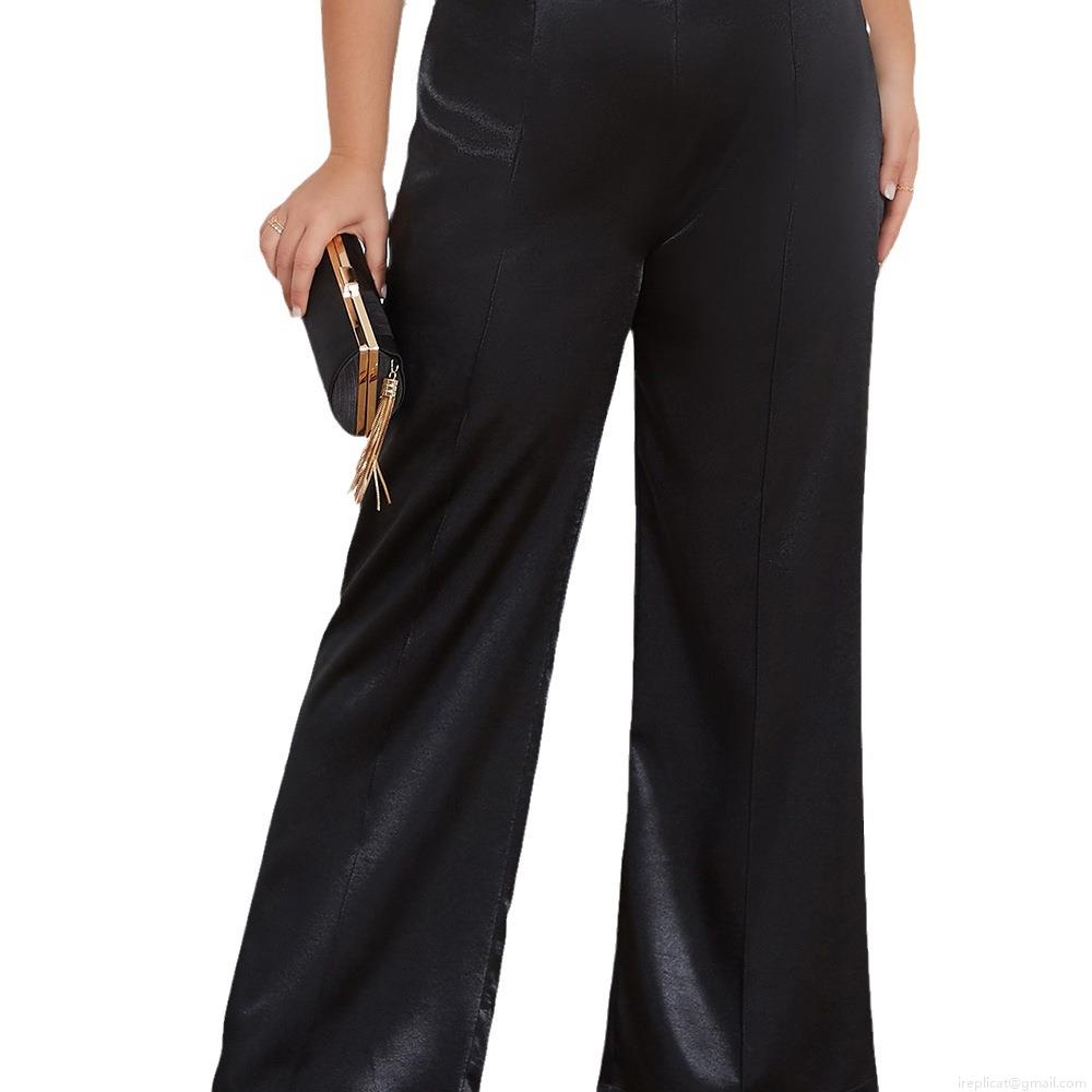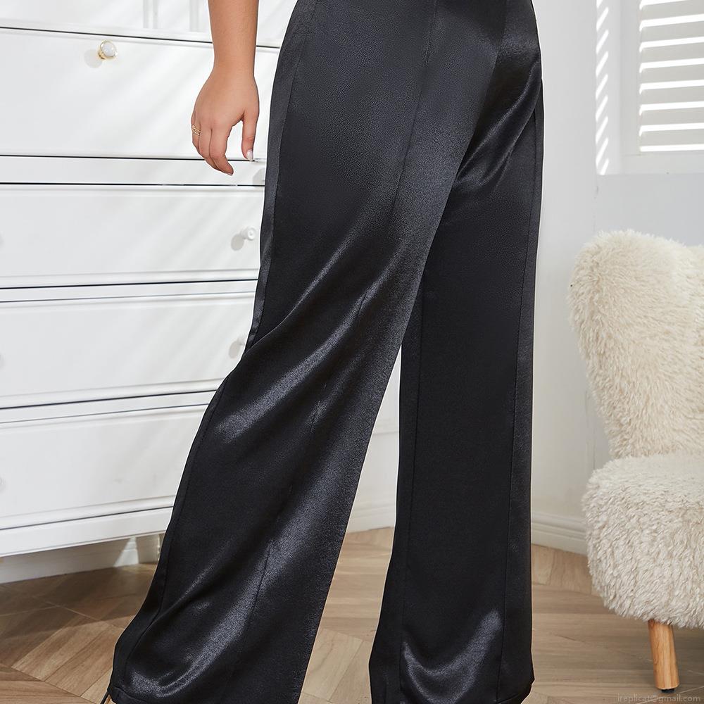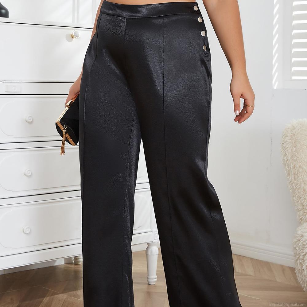 Plus Size Women's Satin Wide-Leg Pants High Waist Loose Elegant Trousers with Side Metal Buttons Solid Black Silk-Like Commuting Plus Size Bottoms for Summer Party Office