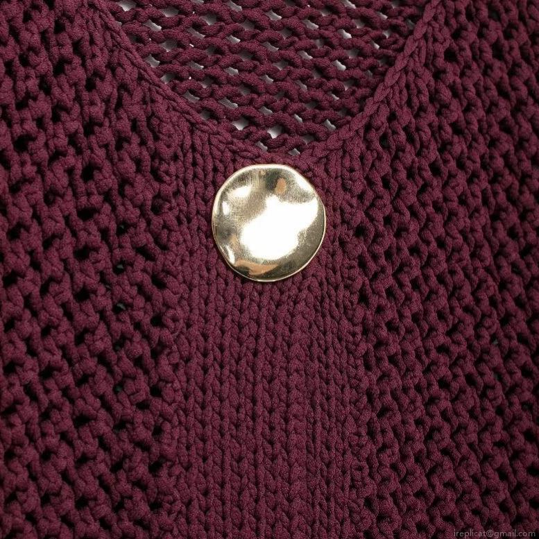 Retro Wine Red Chunky Knit Cardigan Sweater For Women With Gold Metal Buttons V Neck Long Sleeve Short Outerwear Top With Pockets Chic Knitwear