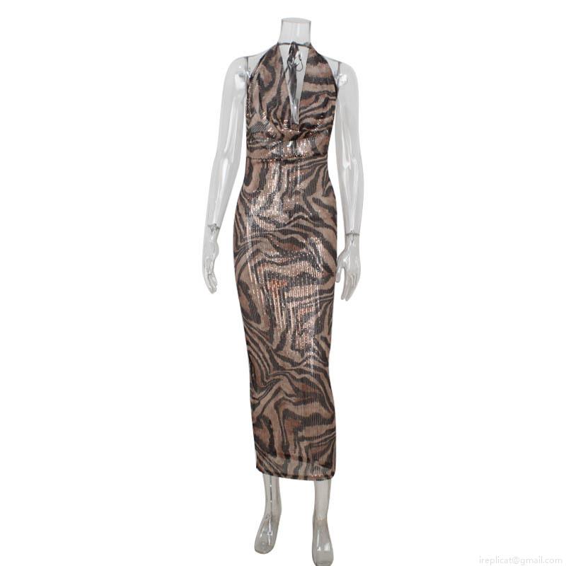 Sequined Leopard Print Halter Deep V Neck Maxi Dress Sexy High Waist Slim Fit Bodycon Evening Party Long Gown For Women