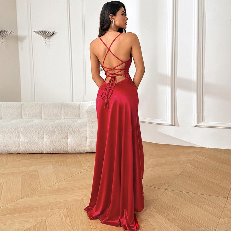 Sexy Backless High Slit Evening Dress Satin Polyester Spandex Spaghetti Strap Cowl Neck Ruched Long Gown For Women Party Banquet Wedding