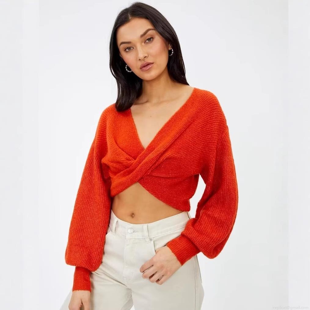 Sexy Backless Knit Sweater Women Autumn Winter Cross Wrap V Neck Long Sleeve Ribbed Crop Top Pullover Fashion Solid Color Polyester Knitwear