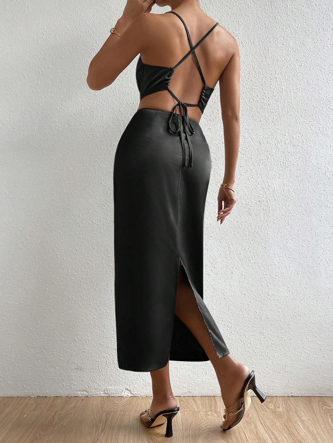 Sexy Backless Satin Cami Midi Dress Cowl Neck Sleeveless Side Cut Out Solid Color Slip Dress For Party Evening Clubwear Women Fashion
