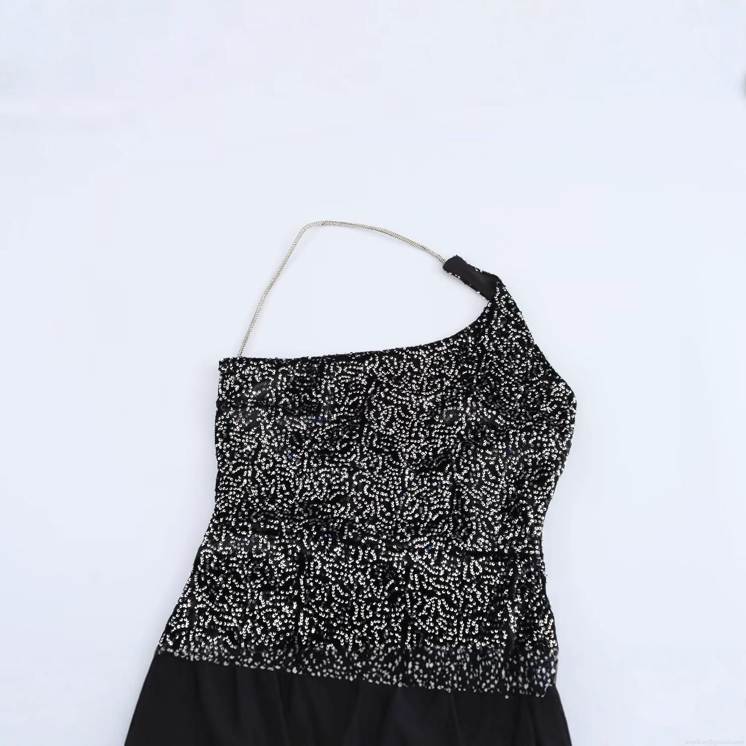 Sexy Black Sequin Asymmetric Maxi Dress For Women Elegant One Shoulder Halter Party Gown With Metal Chain Straps Side Slit Sparkly Evening Formal Dress