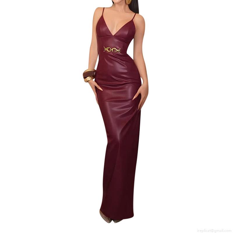 Sexy Burgundy PU Leather Maxi Dress Women Deep V Neck High Split Evening Party Gown Bodycon High Waist Dress With Metal Buckle Decoration