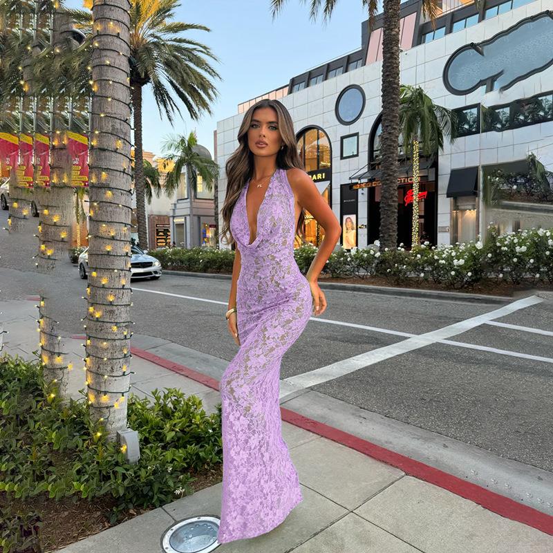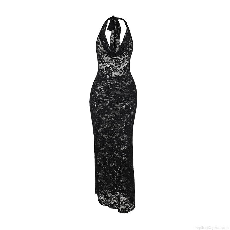 Sexy Lace Halter Backless Maxi Dress Elegant Bodycon Crochet Floral Party Evening Long Dress For Women