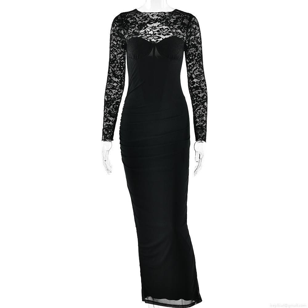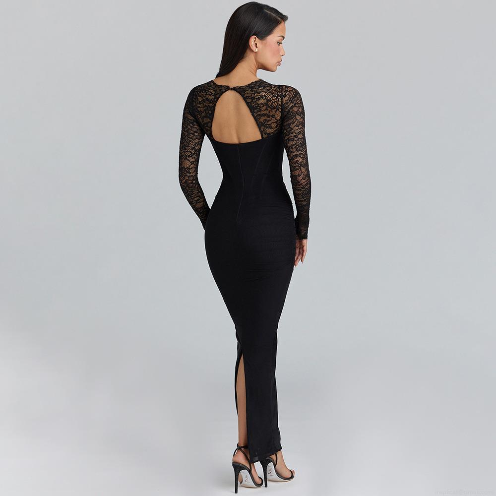 Sexy Lace Stitching Bodycon Dress For Women Mesh Perspective Long Sleeve High Waist Split Evening Gown Elegant Party Nightclub Slim Fit Maxi Dress