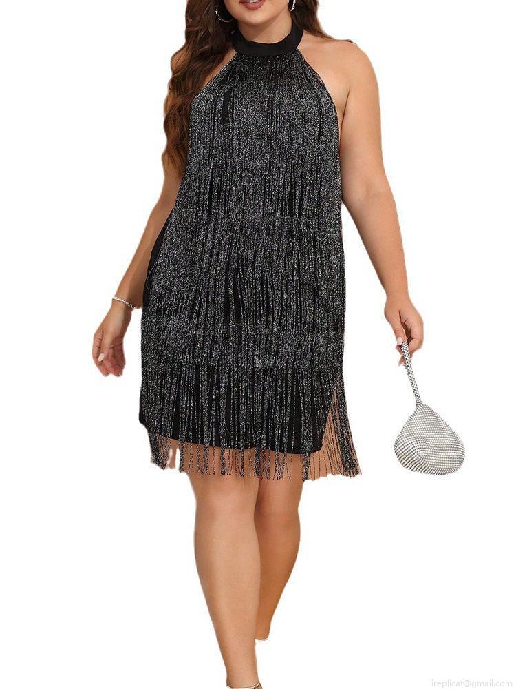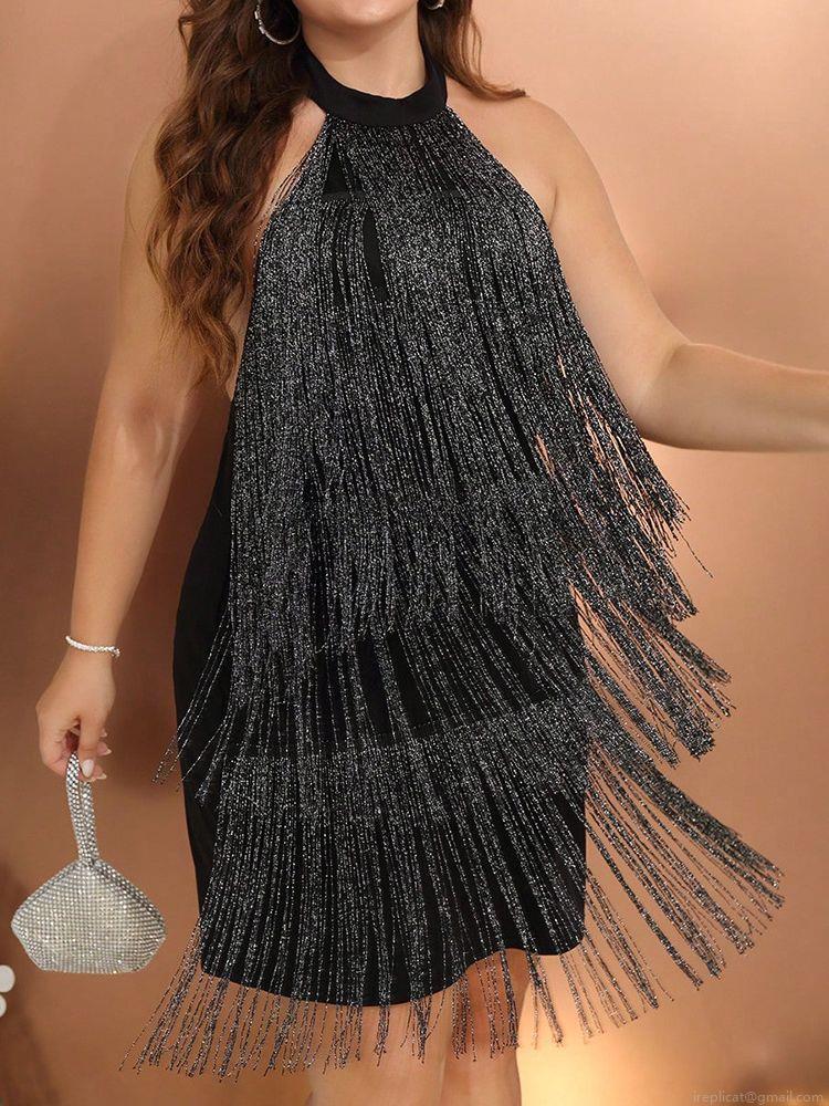 Sexy Plus Size Halter Tassel Mini Dress For Women Glitter Silver Fringe Backless Bodycon Party Club Evening Dress Polyester Spandex High Stretch