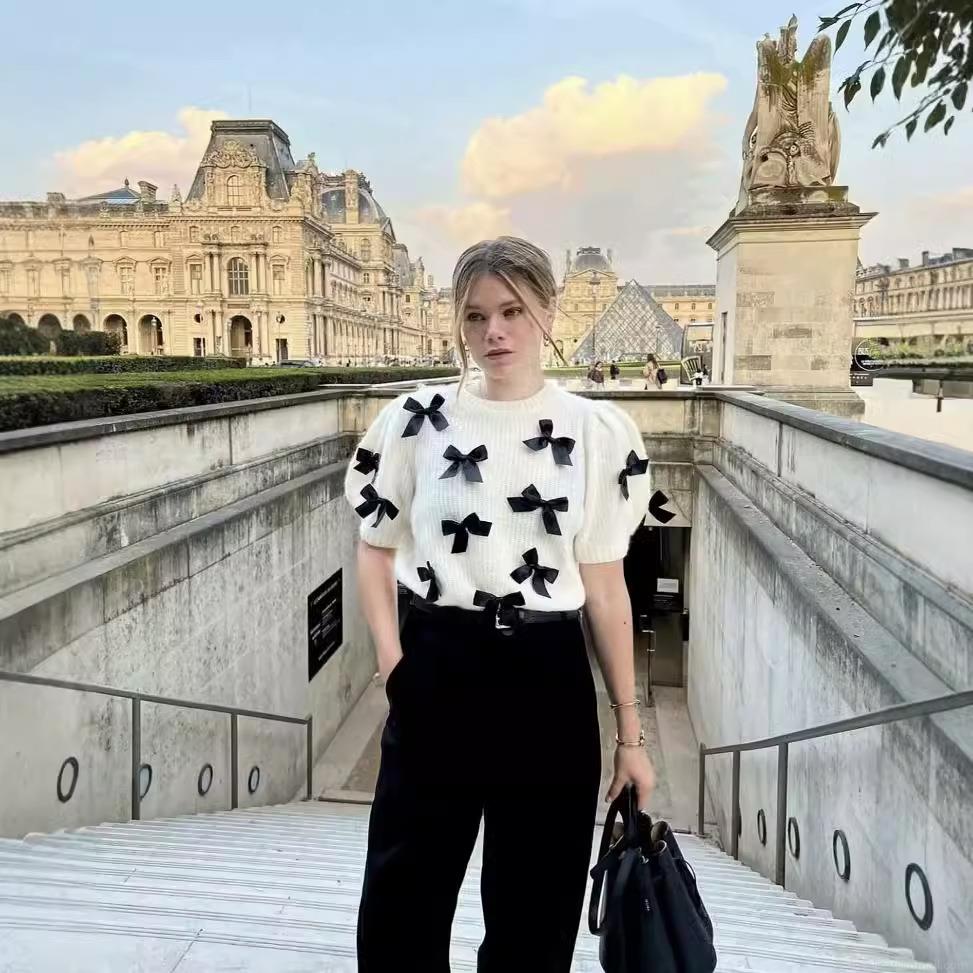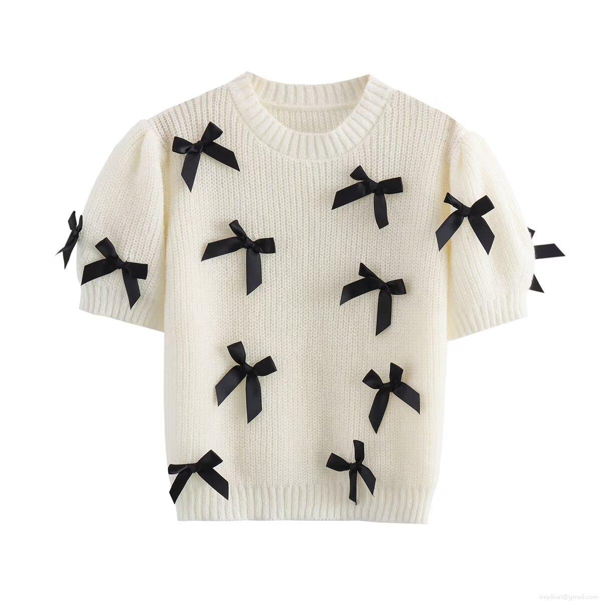Sweet Bowknot Decorated Women's Short Sleeve Knit Sweater Polyester Soft Round Neck Puff Sleeve Pullover Elegant Casual White Knitwear Top For Ladies