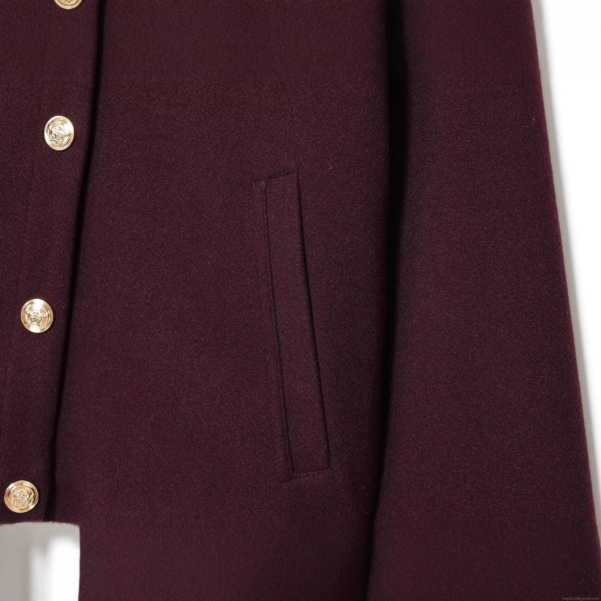 Vintage Women's Burgundy Woolen Jacket With Gold Buttons Round Neck Long Sleeve Casual Streetwear Short Coat Fall Winter Jacket