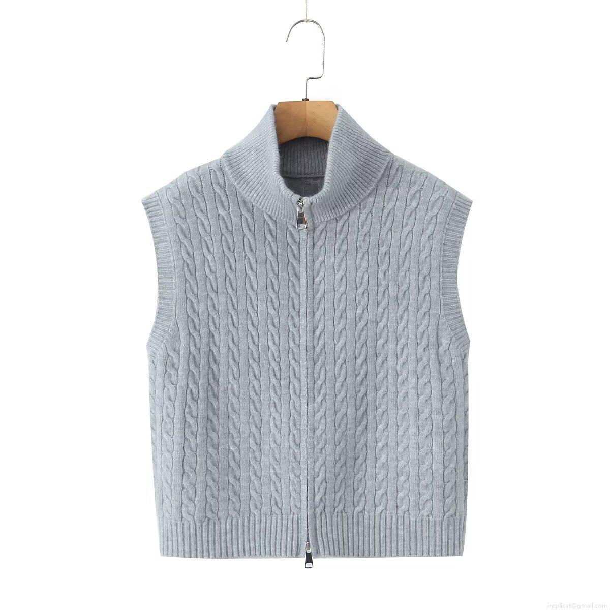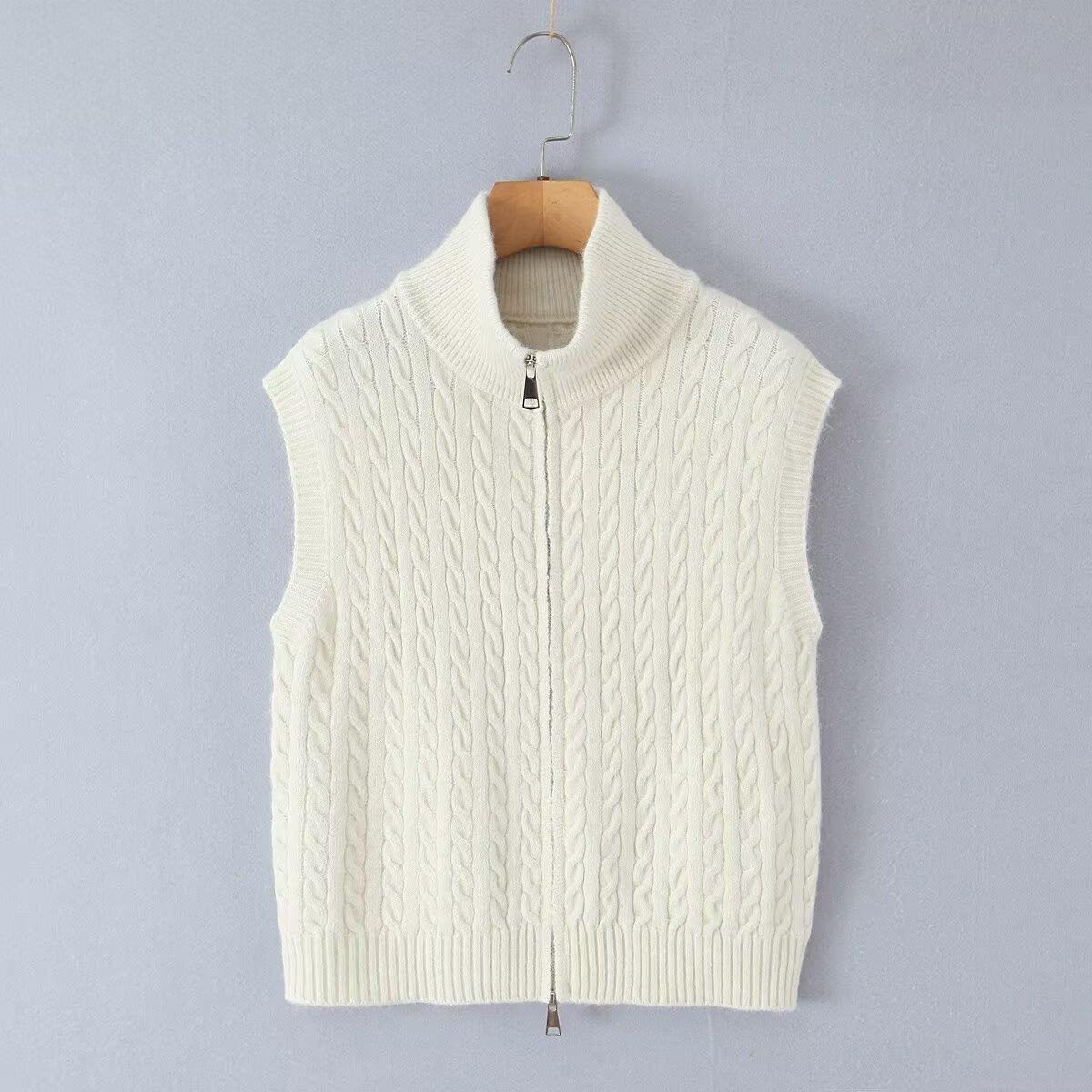 Vintage Women's Cable Knit Vest Polyester Standing Collar Zipper Up Sleeveless Sweater Vest Solid Color Retro Casual Knitwear Top For Daily Outwear