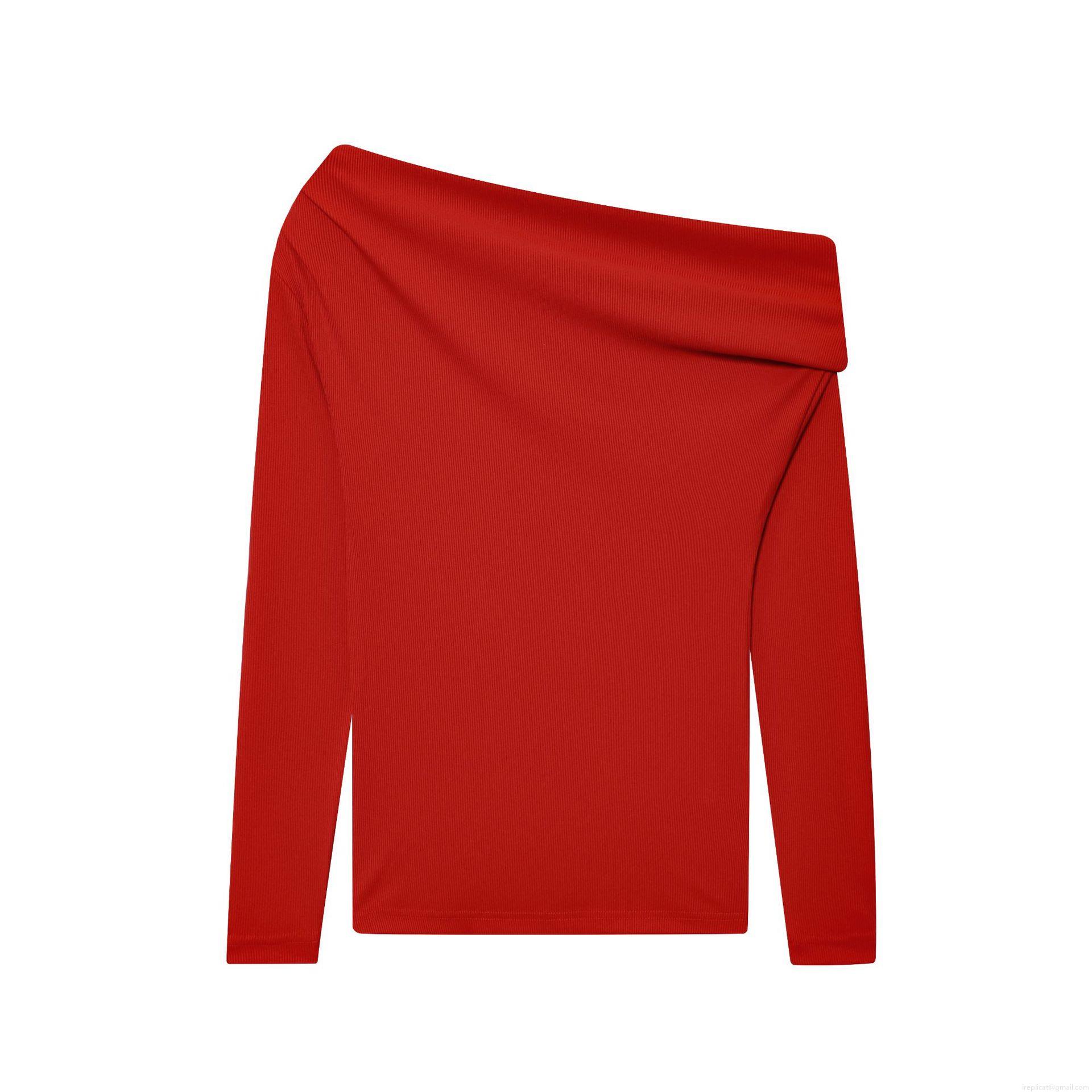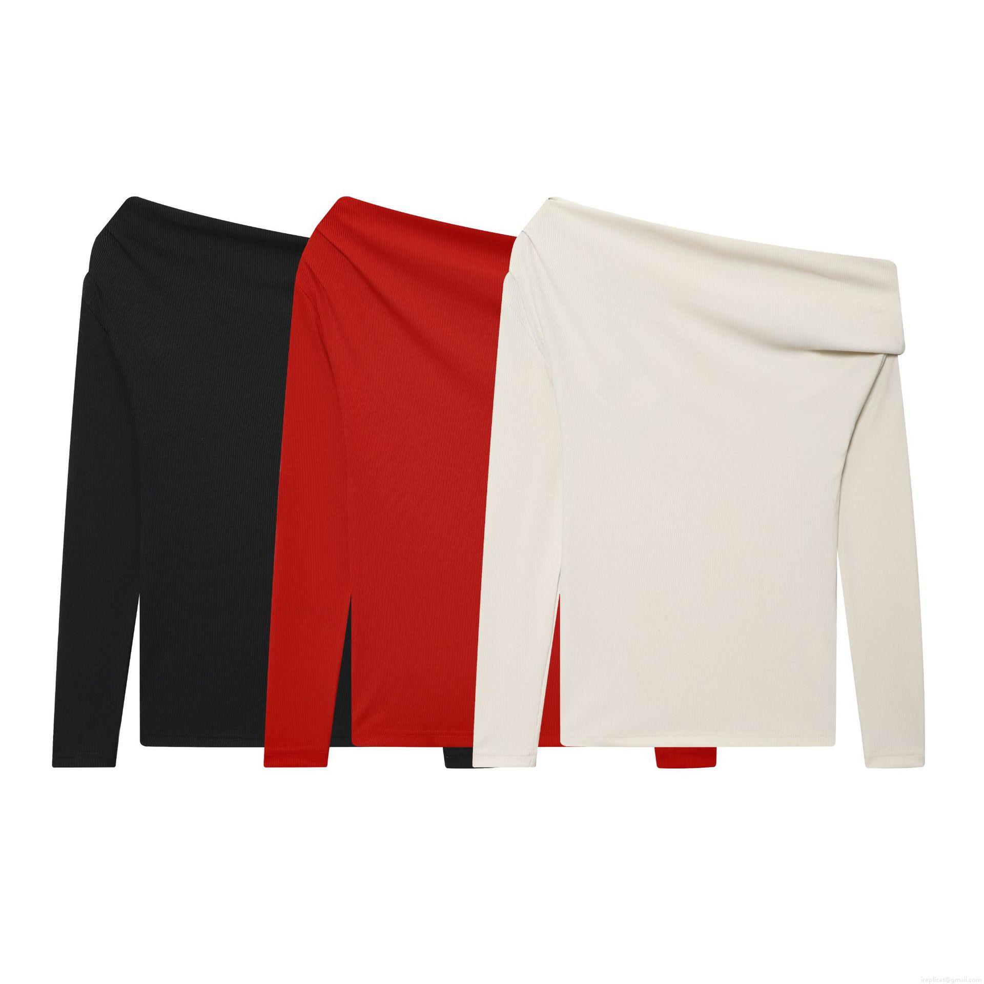 Women Asymmetrical Slant Neck Long Sleeve T-Shirt Ribbed Knit Off Shoulder Slim Fit Sexy Casual Solid Color Streetwear Fashion Tee Top