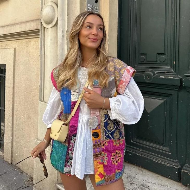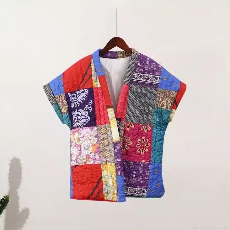 Women Bohemian Patchwork Quilted Vest Sleeveless V-Neck Open Front Waistcoat Vintage Ethnic Printed Cotton Blend Outerwear Top For Lady Casual Style