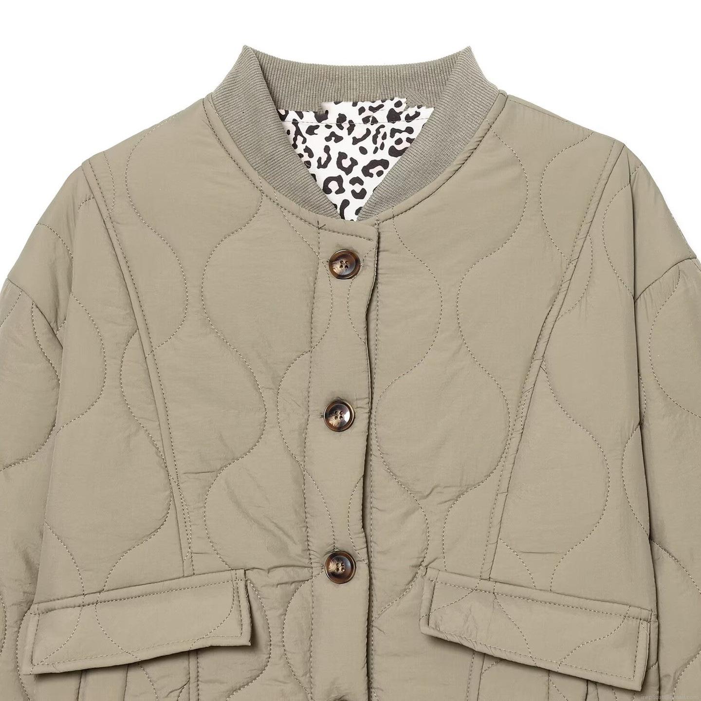 Women Casual Quilted Padded Jacket With Leopard Print Lining Stand Collar Button Up Onion Pattern Padded Coat For Winter Ladies Outerwear