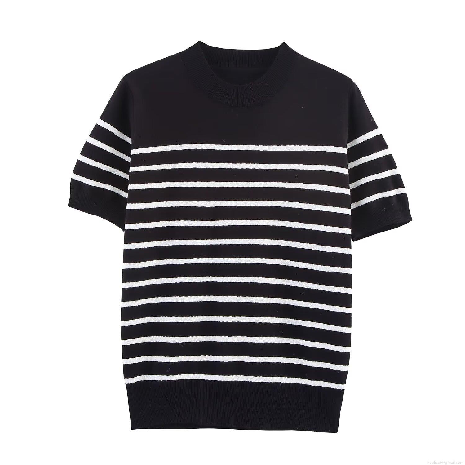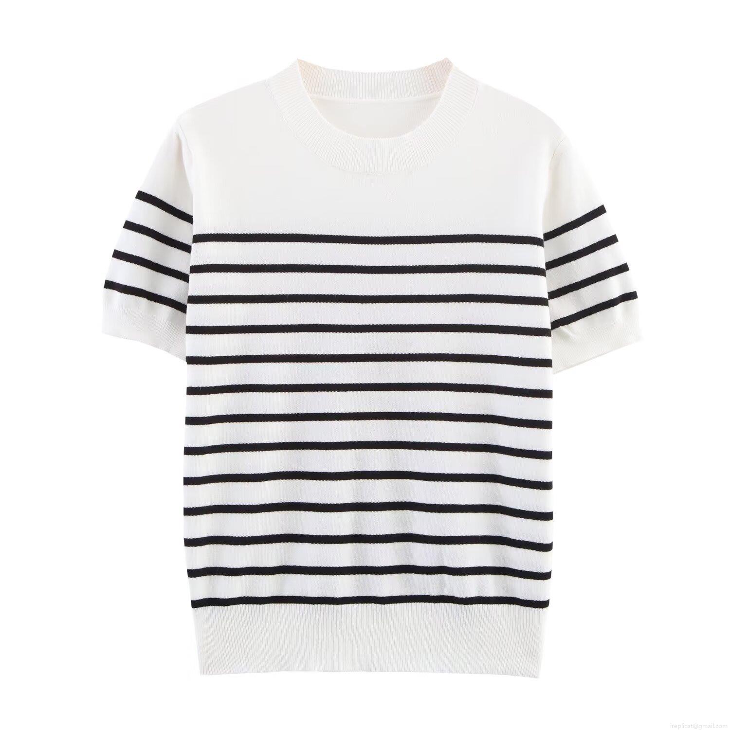 Women's Striped Knit T-Shirt Cotton Blend Hollow Out Crochet Short...