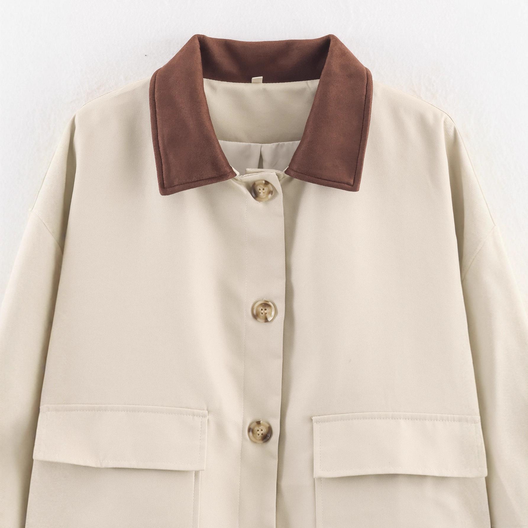 Women Contrast Suede Trim Patchwork Jacket Autumn Long Sleeve Lapel Collar Single Breasted Coat With Large Pockets For Casual Streetwear
