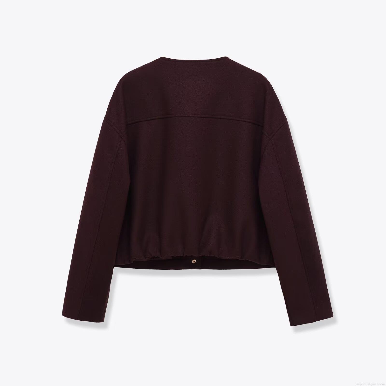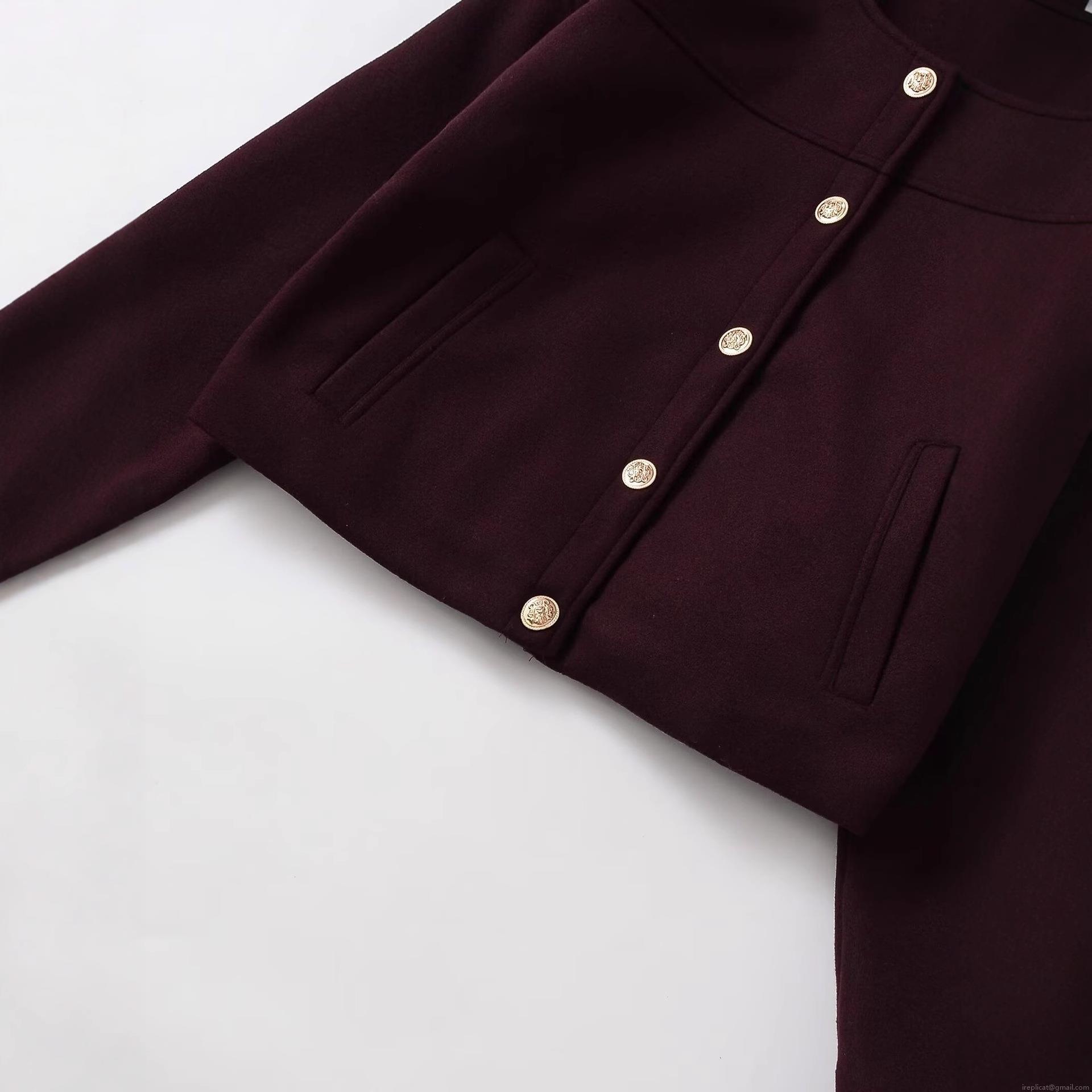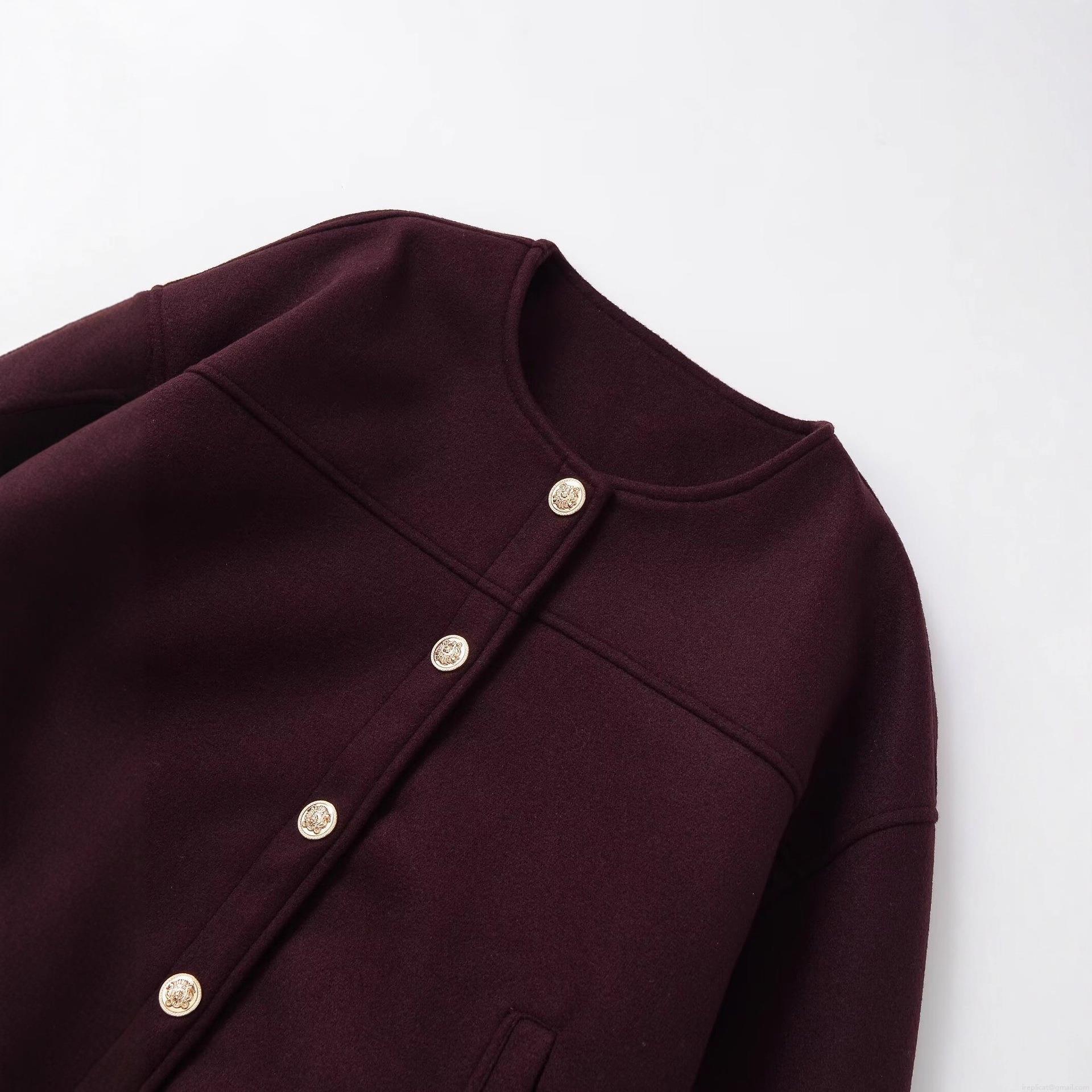 Women Elegant Burgundy Short Jacket Coat With Gold Embossed Buttons Round Neck Long Sleeve Casual Outerwear Polyester Clothing For Lady