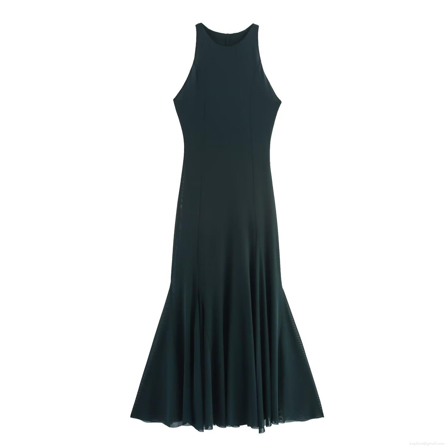 Women Elegant Halter Neck Sleeveless Mesh Mermaid Maxi Dress Slim Fit Solid Color Polyester Evening Party Celebrity Style Formal Long Dress