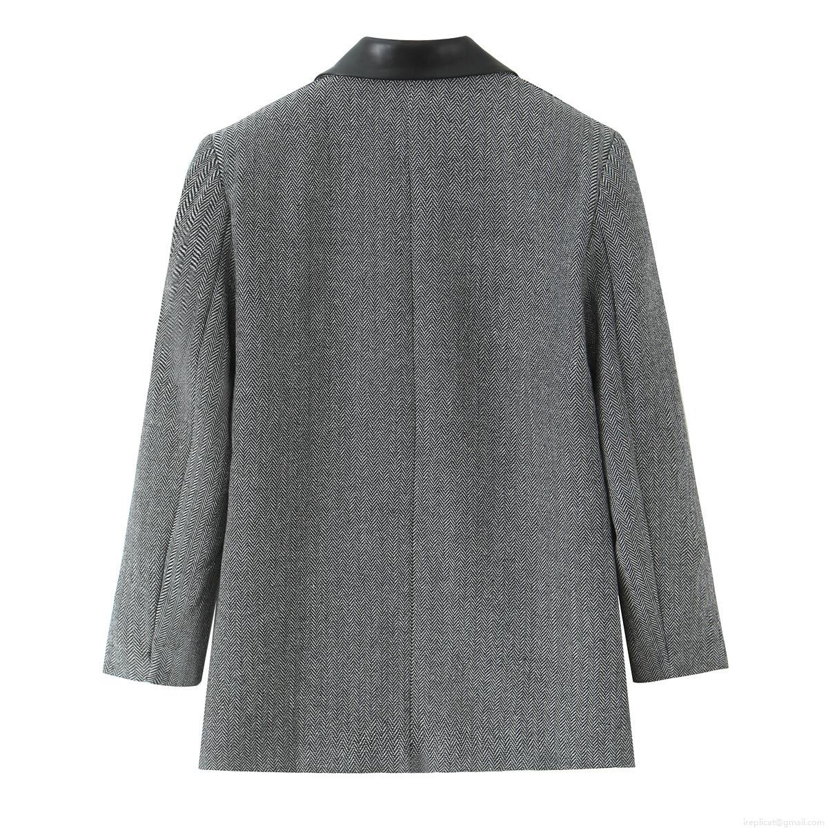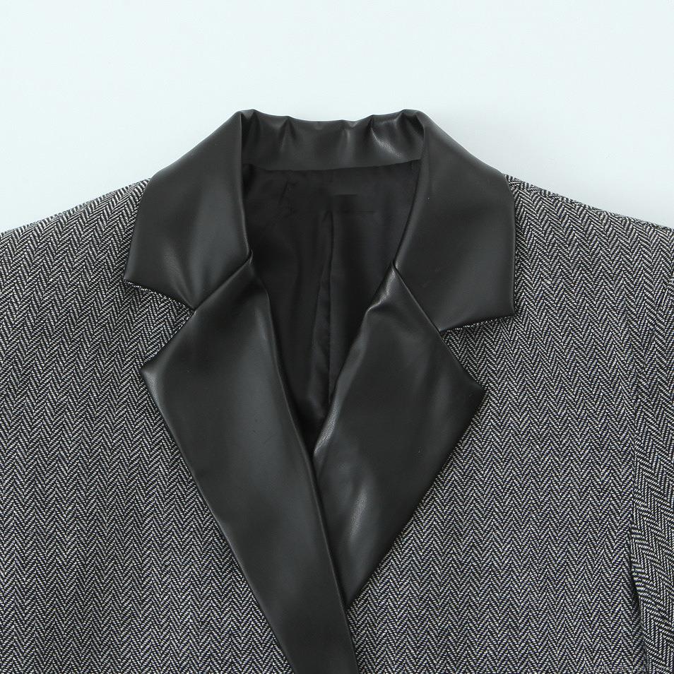 Women Elegant Herringbone Blazer Jacket With PU Leather Patchwork Lapel Collar Double Breasted Long Sleeve Loose Fit Casual Outerwear For Office Lady