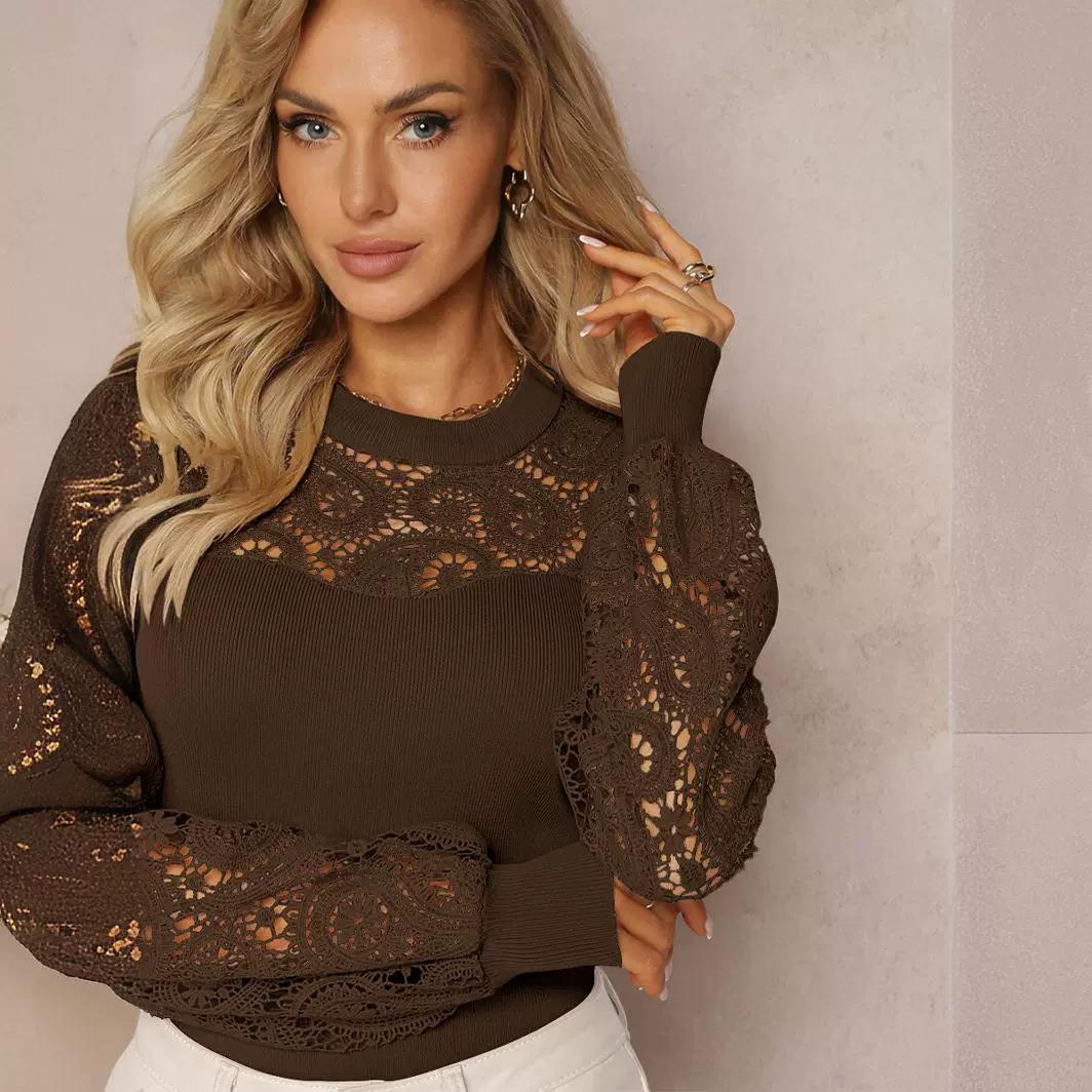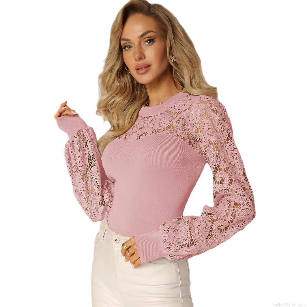 Women Elegant Lace Splicing Long Sleeve T-Shirt Viscose Rib Knit Hollow Out Crew Neck Blouse Top For Office Party Lady