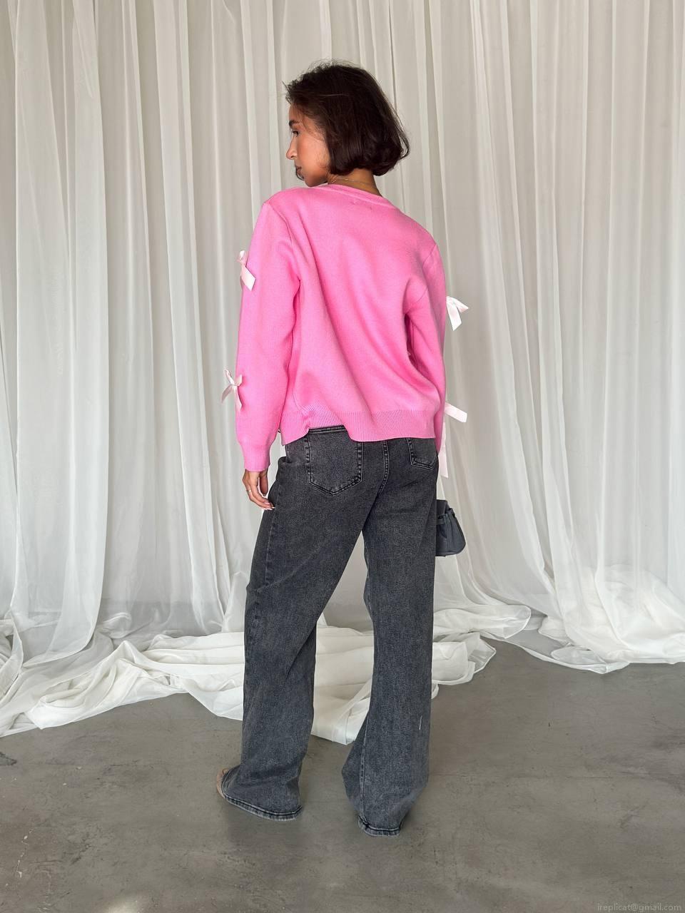 Women Elegant Pink Knitted Cardigan Sweater With Satin Ribbon Bow Decor Long Sleeve Cotton Blend Single Breasted Loose Fit Casual Chic Tops