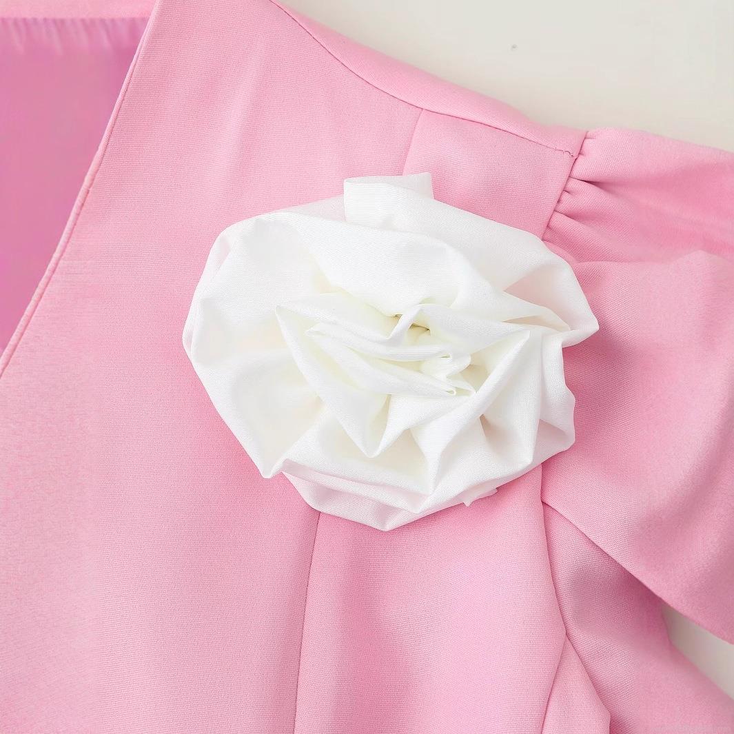 Women Elegant Short Sleeve Blazer Top V-Neck Waist-Cinching Slim Fit Jacket With Handcrafted 3D Flower Single Breasted Puff Sleeve Blouse For Ladies Pink