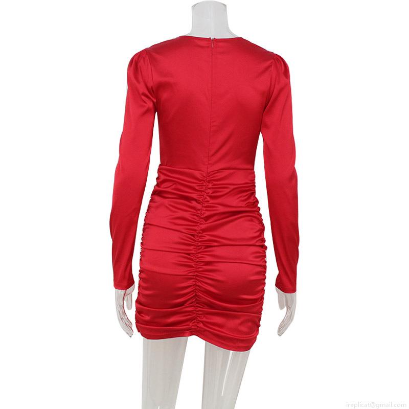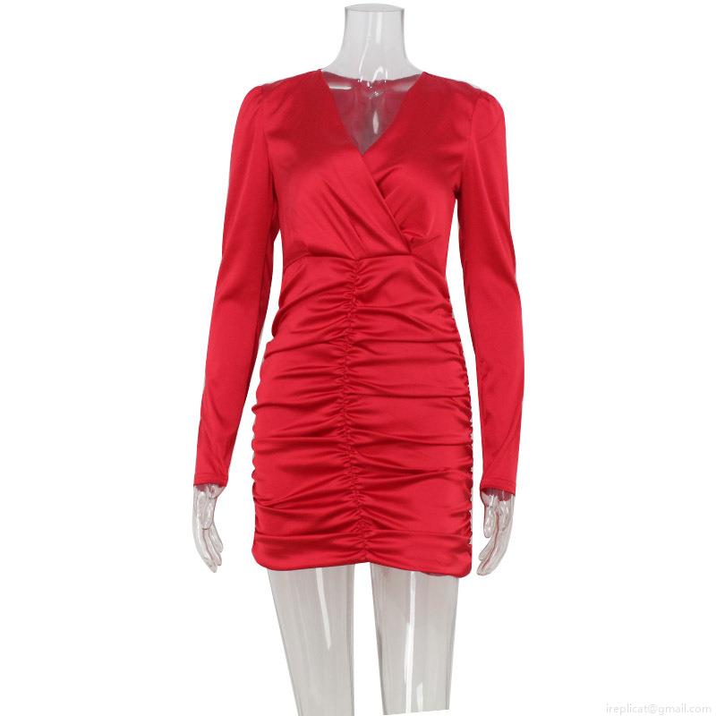 Women Elegant V Neck Ruched Bodycon Dress Satin Long Sleeve Slim Fit Mini Party Club Dress For Ladies Vintage Sexy Evening Gown