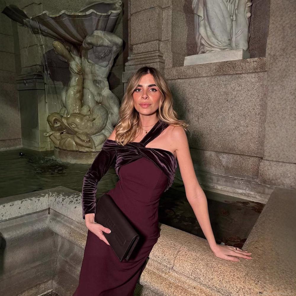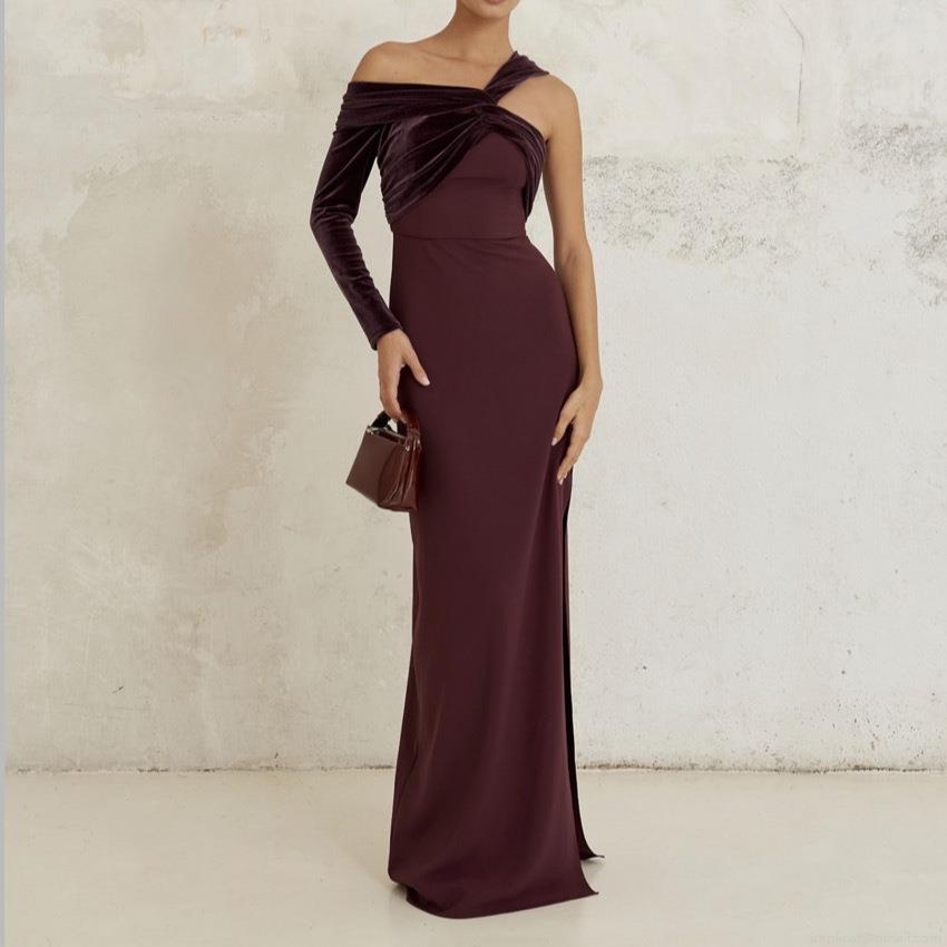 Women Elegant Velvet Patchwork One Shoulder Long Sleeve Maxi Dress Sexy Asymmetric Side Slit Formal Evening Party Prom Bodycon Gown